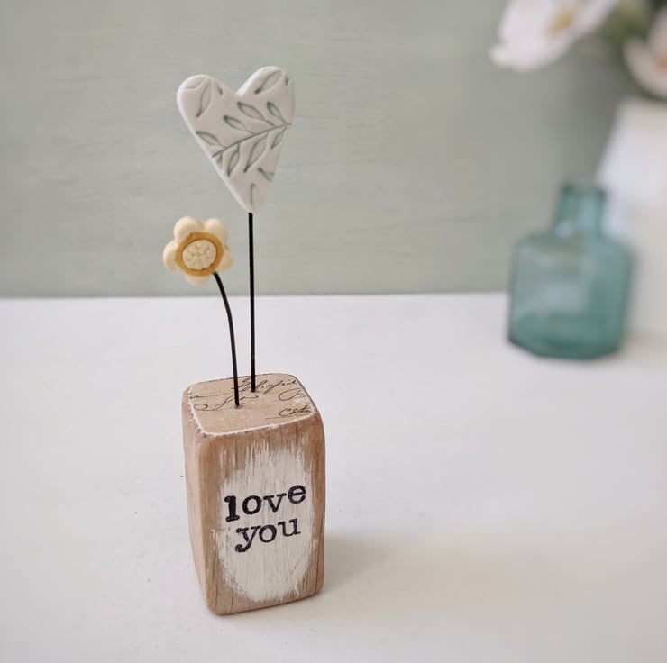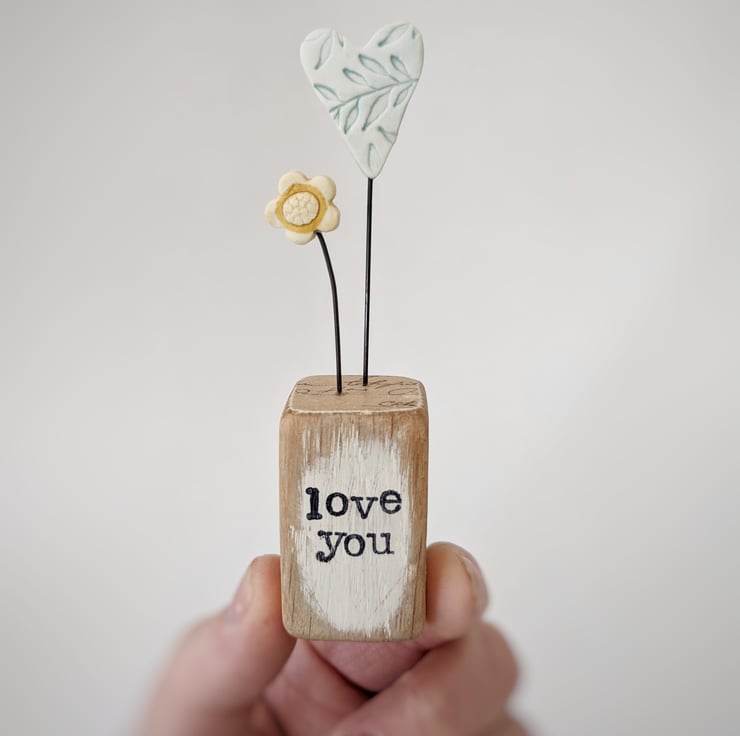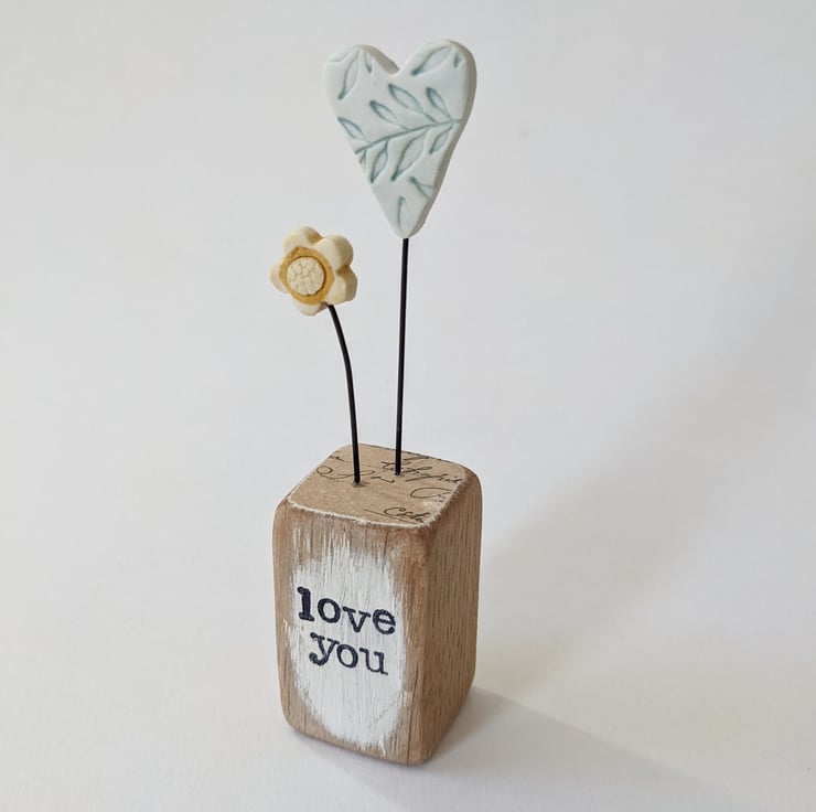 The top of the wooden block is decoupaged with patterned paper and the front hand stamped with the words 'Love You'.