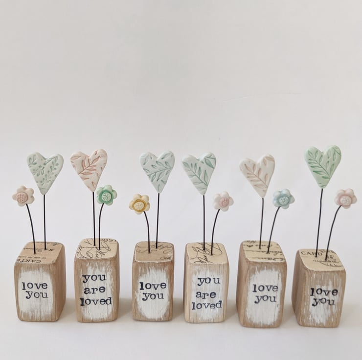 A little patterned heart and teeny flower stand on a wire stalks in a sanded and stamped oak wood block.