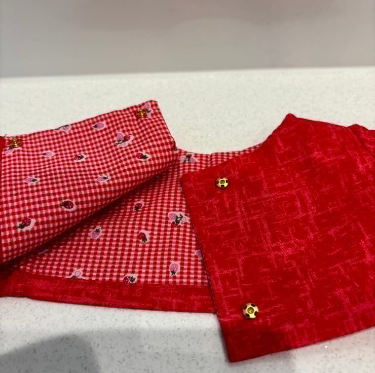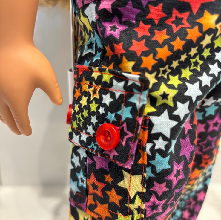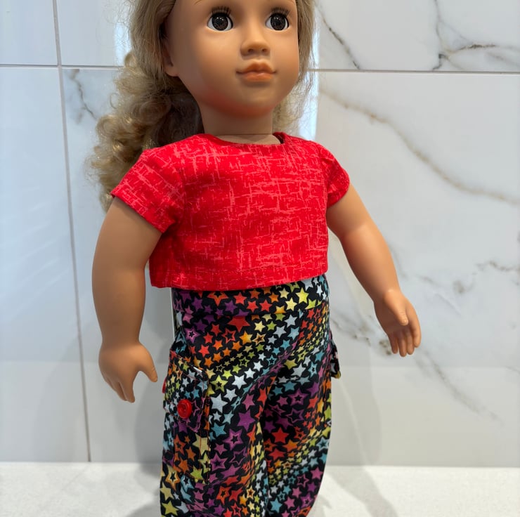 The trouser pockets and the top are closed with small buttons and snap fasteners. Suitable for children over 3 years. Small parts. Made to fit 18”/46cm dolls. Our Generation Brand.