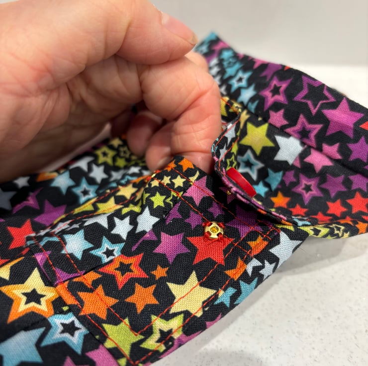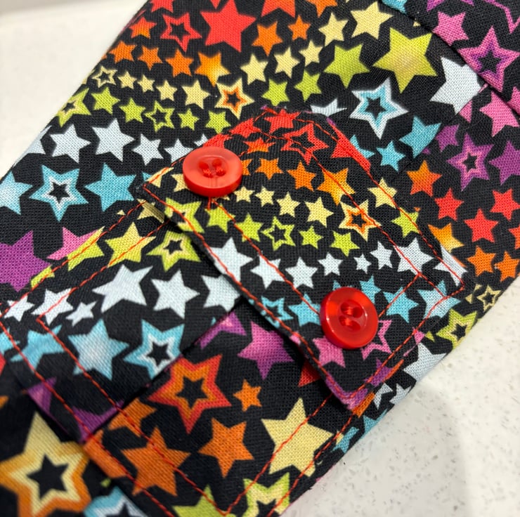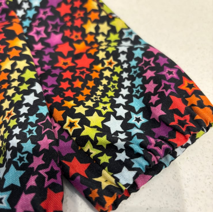 These are classic cargo trousers, with functional side pockets. The trousers are drawn in a little with elastic. The trousers pull on. The fabric is a whole rainbow of colours stars. Colours are bright on a black background. The top is cropped style lined in a coordinating fabric.