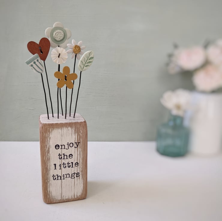 A pretty clay flower stands on a wire stalk in a painted wooden block.