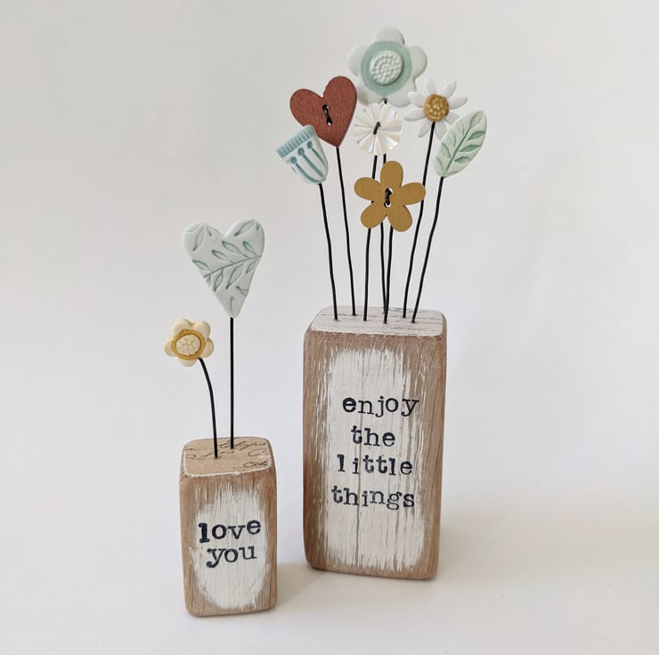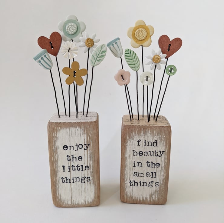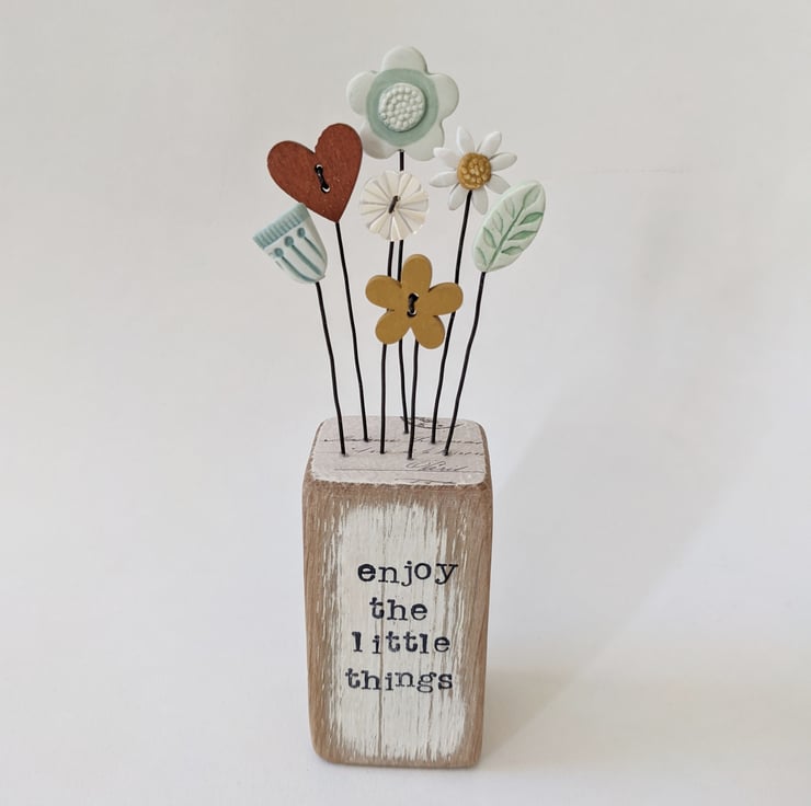 A little clay leaf, daisy and flower bud with vintage and wooden button flowers make up a happy garden.