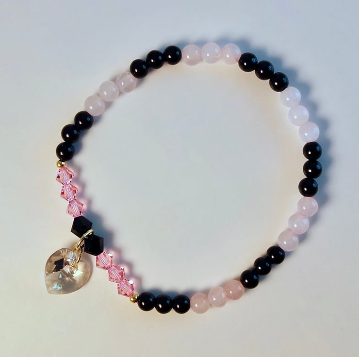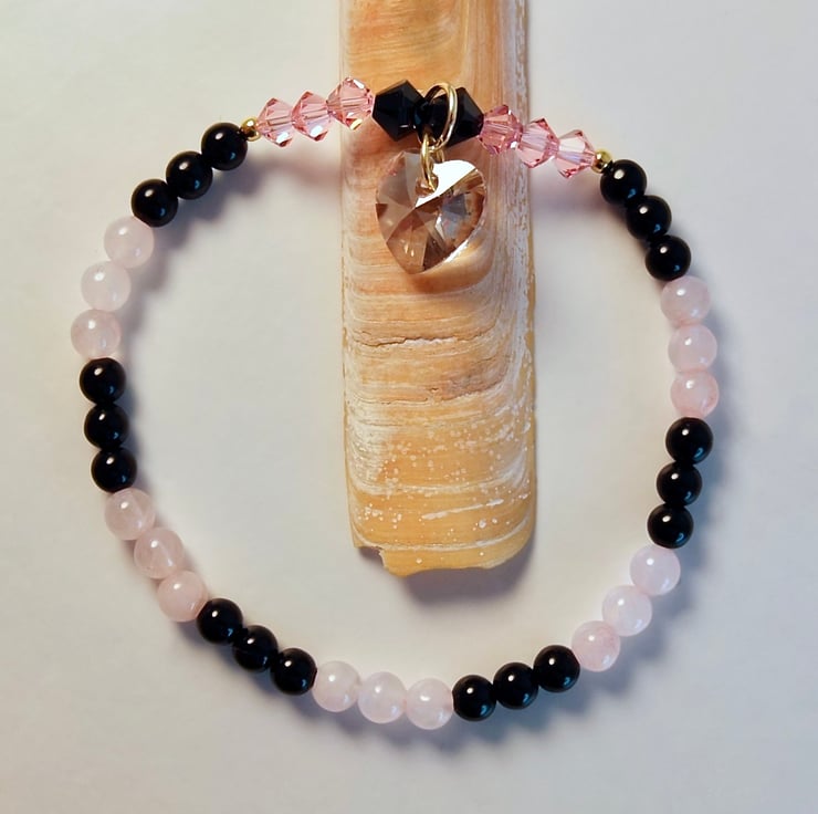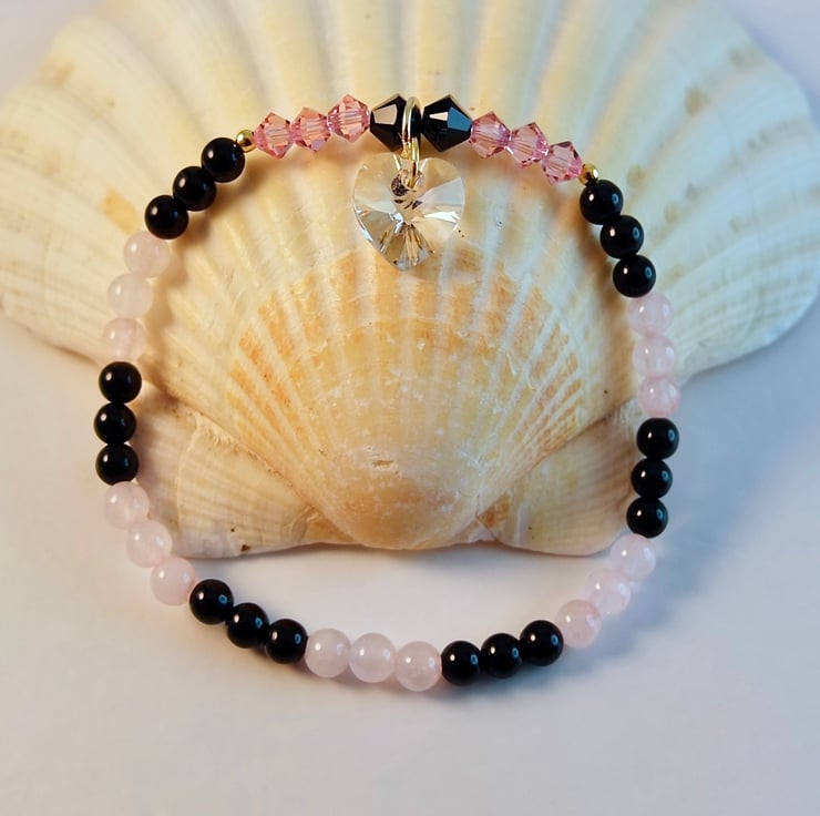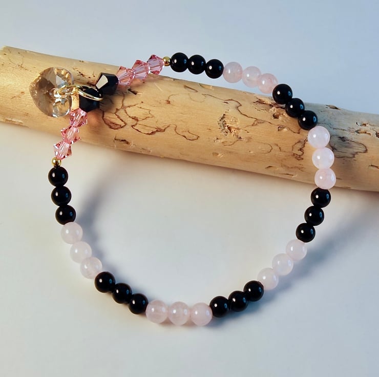 The body of the bracelet is made from alternating trios of 4mm Rose Quartz and Black Onyx beads.