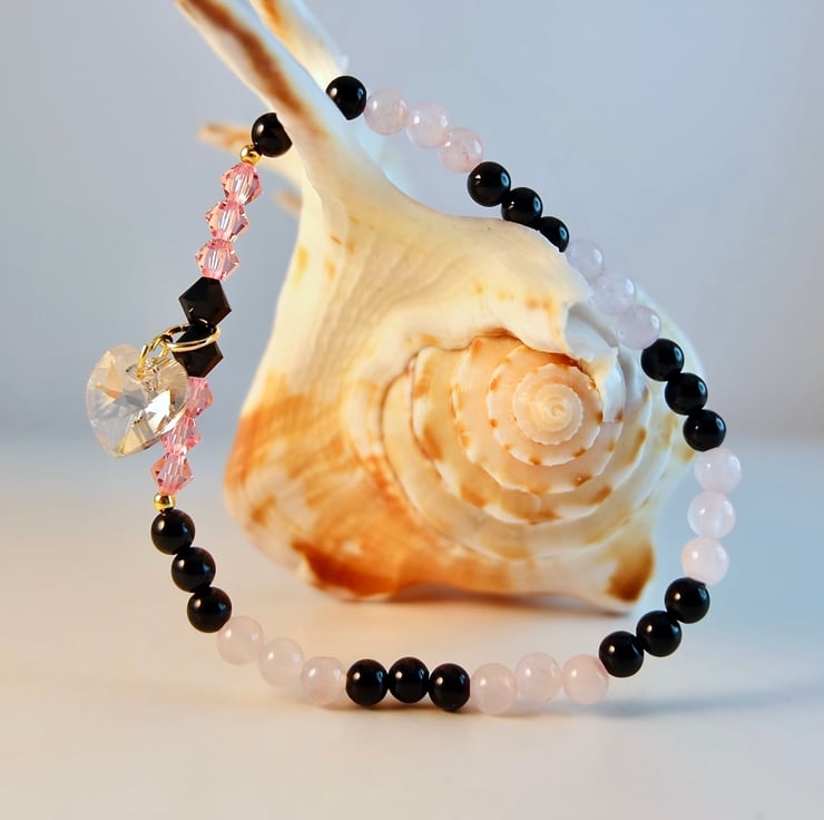 Dainty bracelet featuring a 10mm Swarovski crystal heart set between a pair of 5mm Swarovski 'jet' and trios of 4mm Swarovski 'light rose' crystal bicones.
