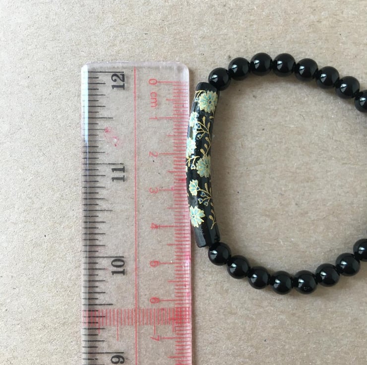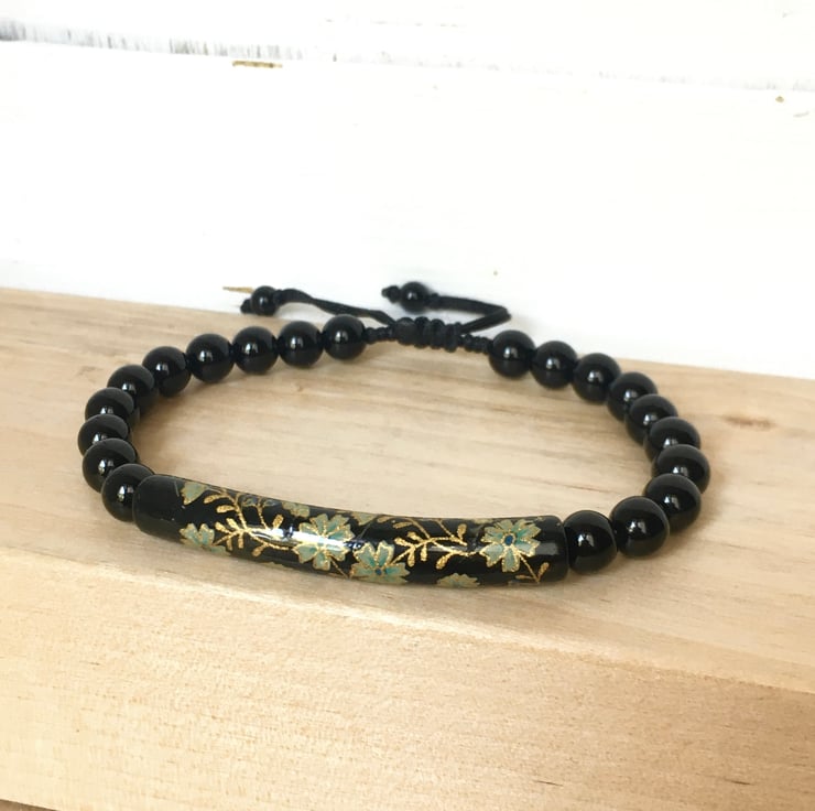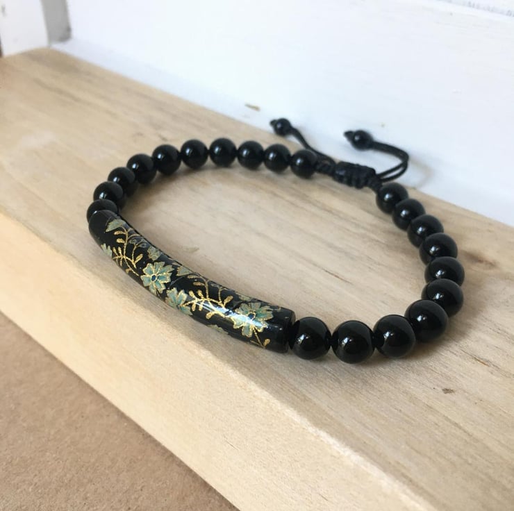 Japanese art upcycled hand painted gold and black colour flower design ceramic long tube bead & onyx semi precious stones adjustable bracelet - couple bracelet - Party Gifts