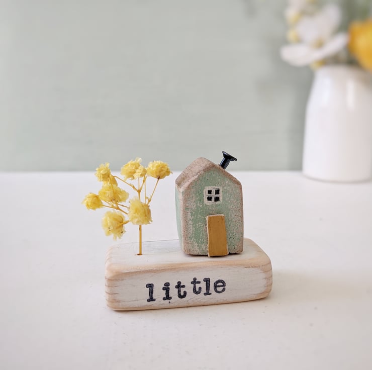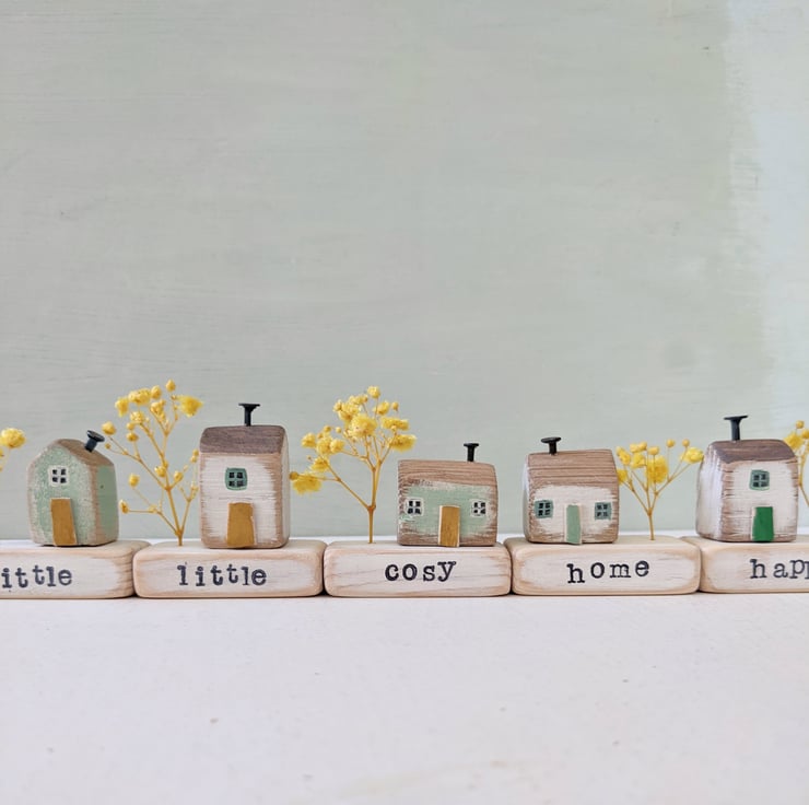 A hand stamped wooden base with a teeny painted house and seasonal sprig.