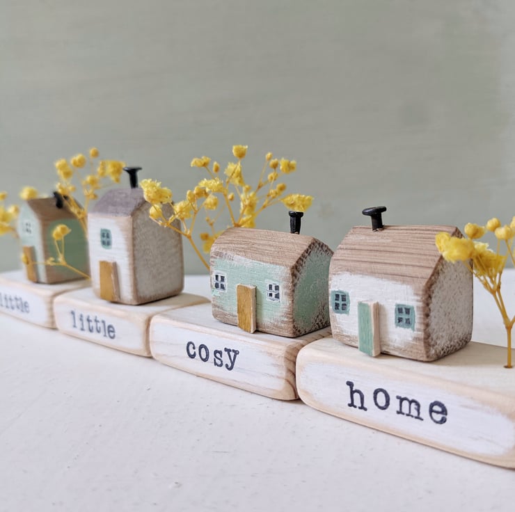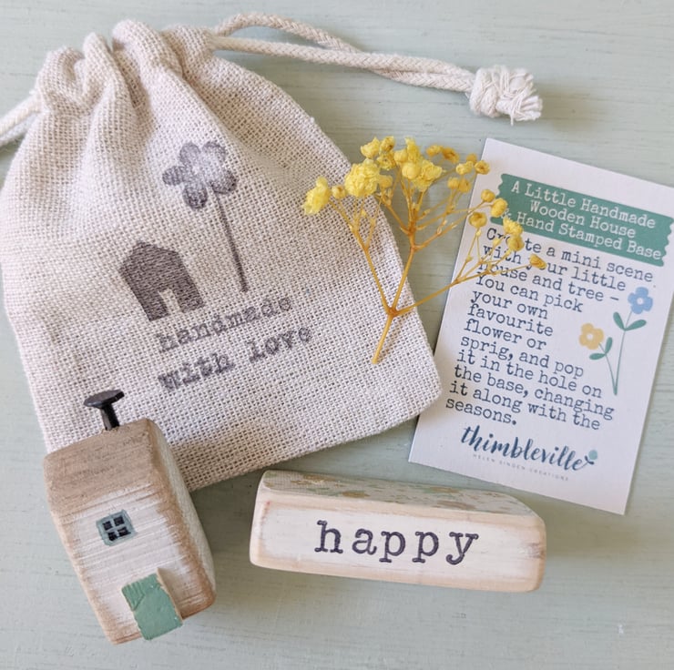 A hand stamped wooden base with a teeny painted house and seasonal sprig.