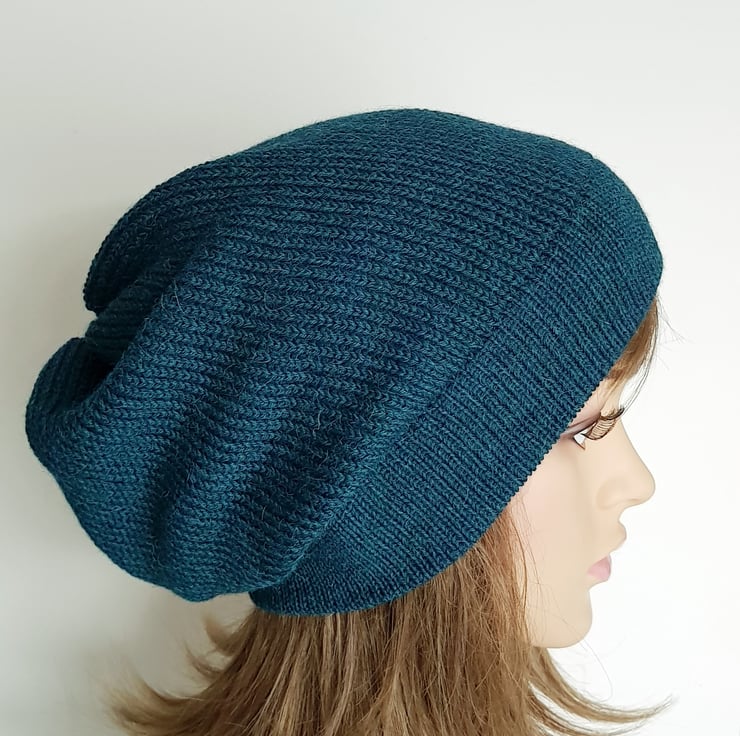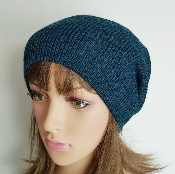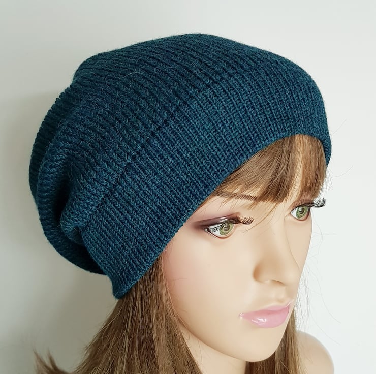 Alpaca blend slouch hat, teal handmade baggy beanie, slouchy beanie.
