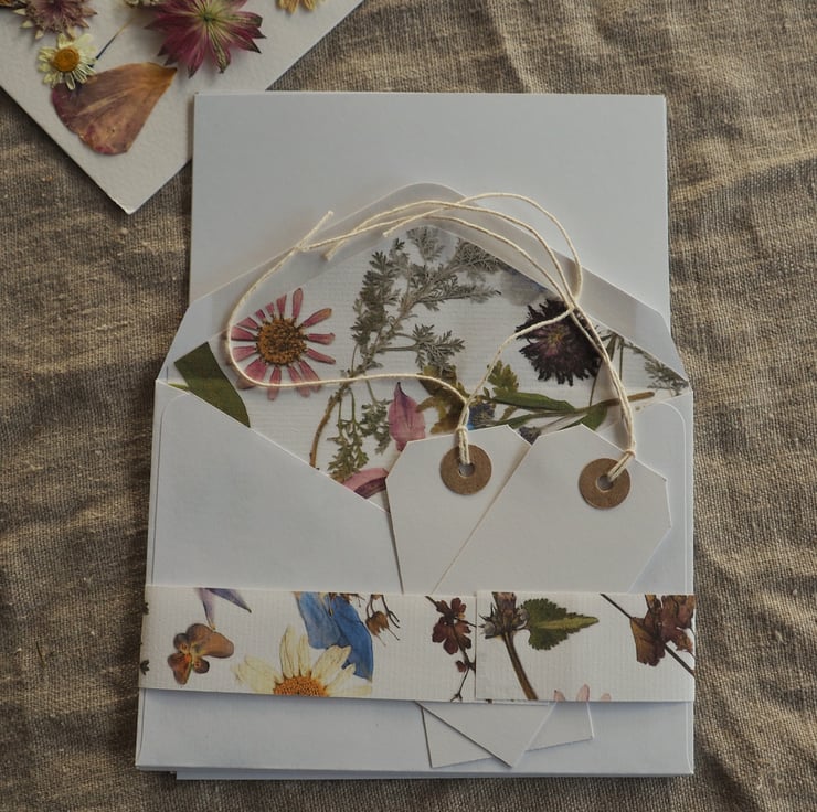 Your card making kit includes: 4 blank white greetings cards with specially matching lined white envelopes, 2 gift (parcel) tags and an assortment of pressed flowers and foliage in a mix of colours.