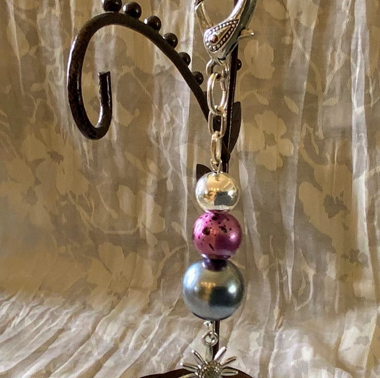 A silver metal Sunflower with three complementary baubles in pewter, Dusty crackle effect pink and shiny silver.