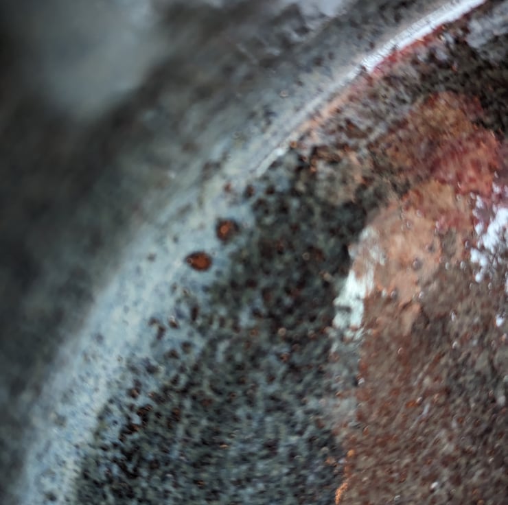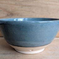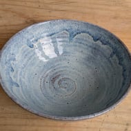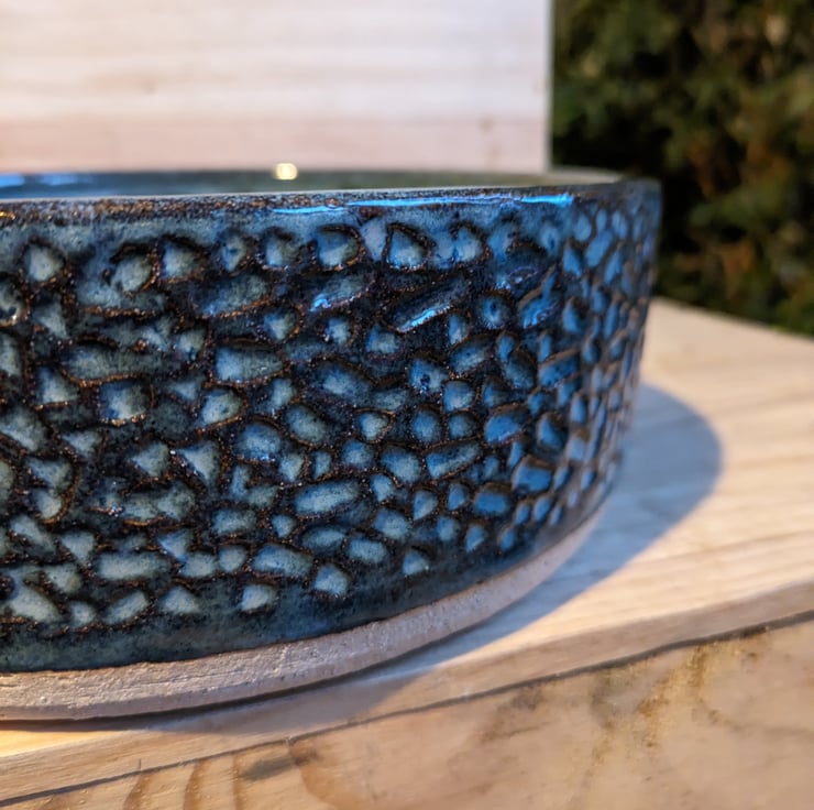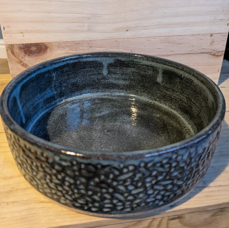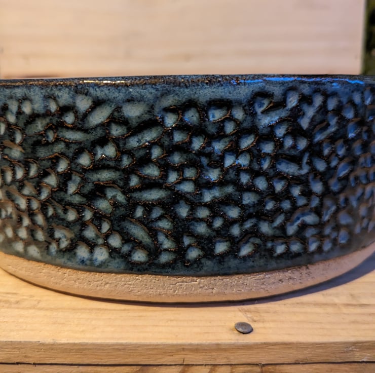 I've used a flecked, slightly less textured clay for this higher sided bowl and carved a bit of texture into the sides. Also, love the toasty colour it comes out as when it's fired. A new glaze, dark in the flatter areas, greeny blue where it sits in the carved areas. I also love having the bottom edge of the clay exposed...great to get the feel of the clay. Perfect as a serving dish or for salad.