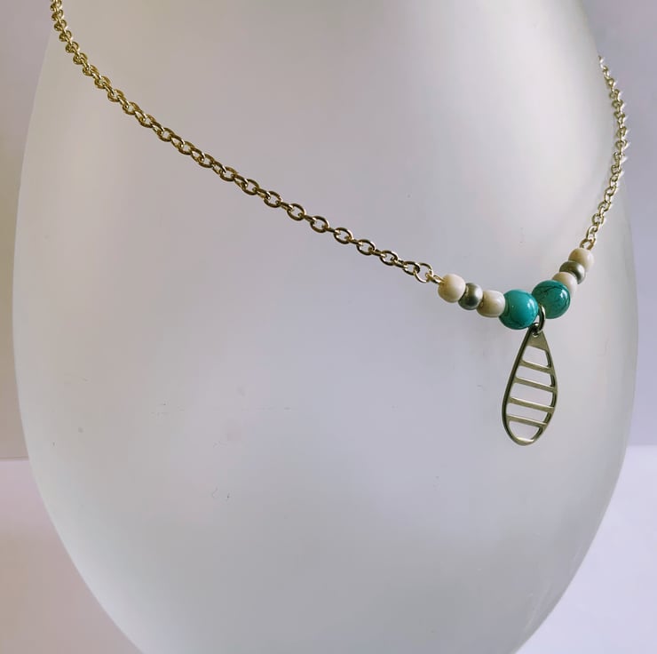 A modern diagonal striped design pendant centered between aquamarine marble glass beads and white and silver mini rochelles. On an 18inc silver plated cable chain that will not rust or tarnish.