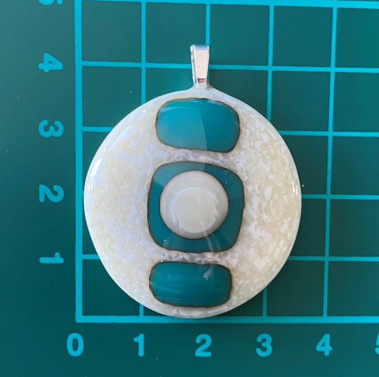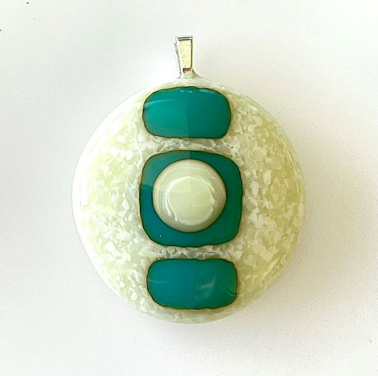 This unique pendant was made with hand crushed vanilla reactive glass, with added teal square cut glass and pre-fired French Vanilla glass dots. The chemicals in the glass react when placed with other reactive glasses, creating the coloured outlines which add to the design. It was moulded at 800 degrees Celsius to create one solid round piece of glass. Once cooled a silver plated jewellery bail was added so it can be hung on a choice of black cord or silver plated snake chain.