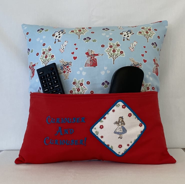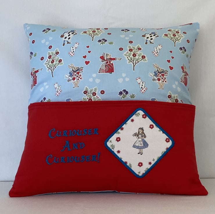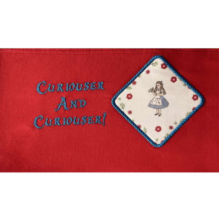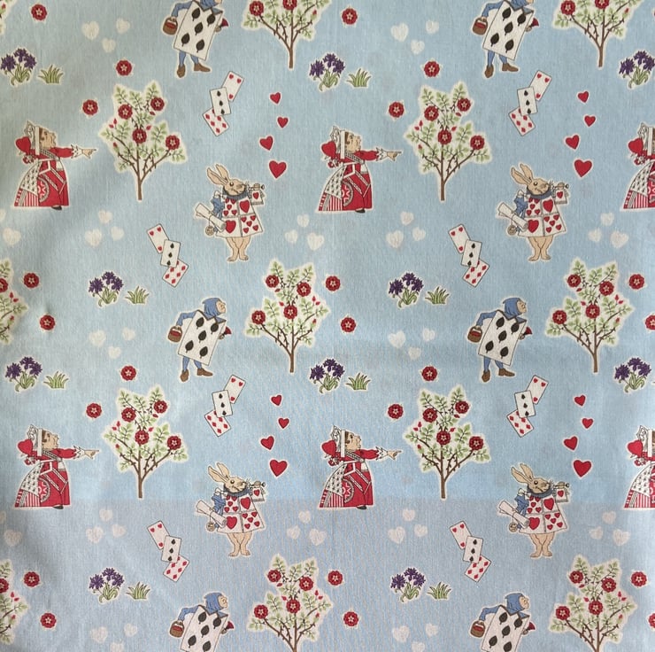 The pocket front is red and the fabric is 100% cotton featuring Alice In Wonderland.