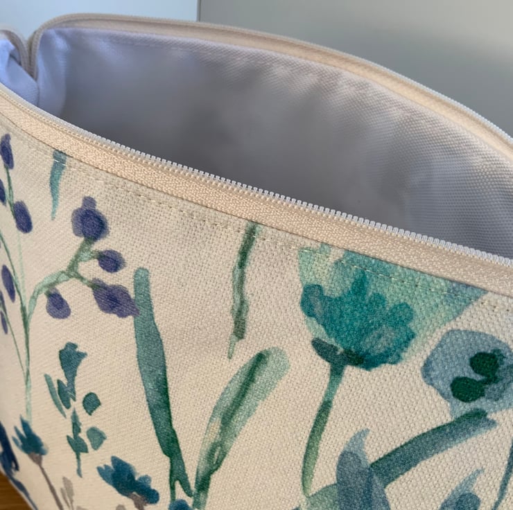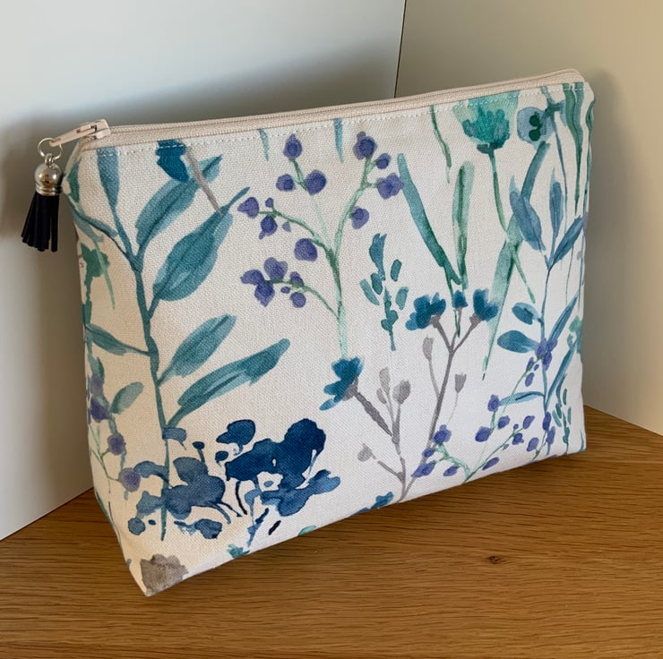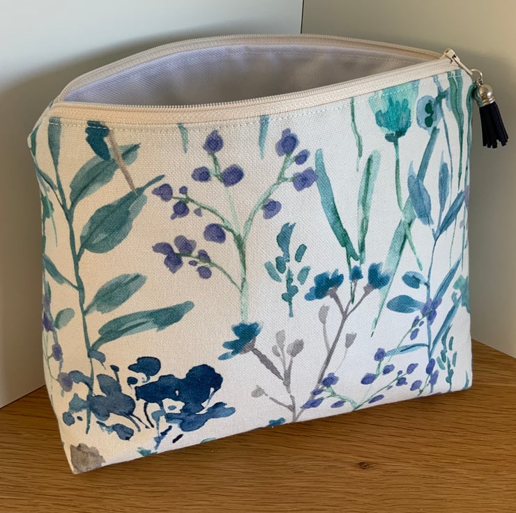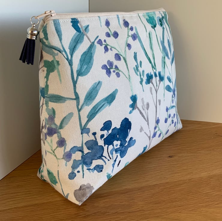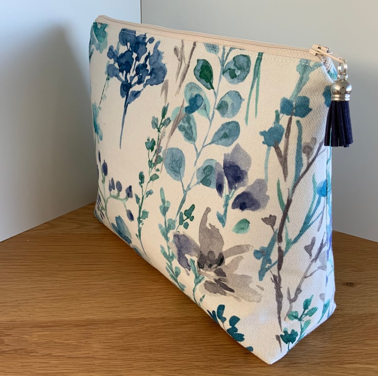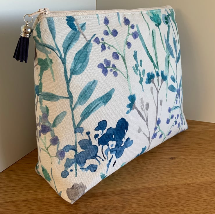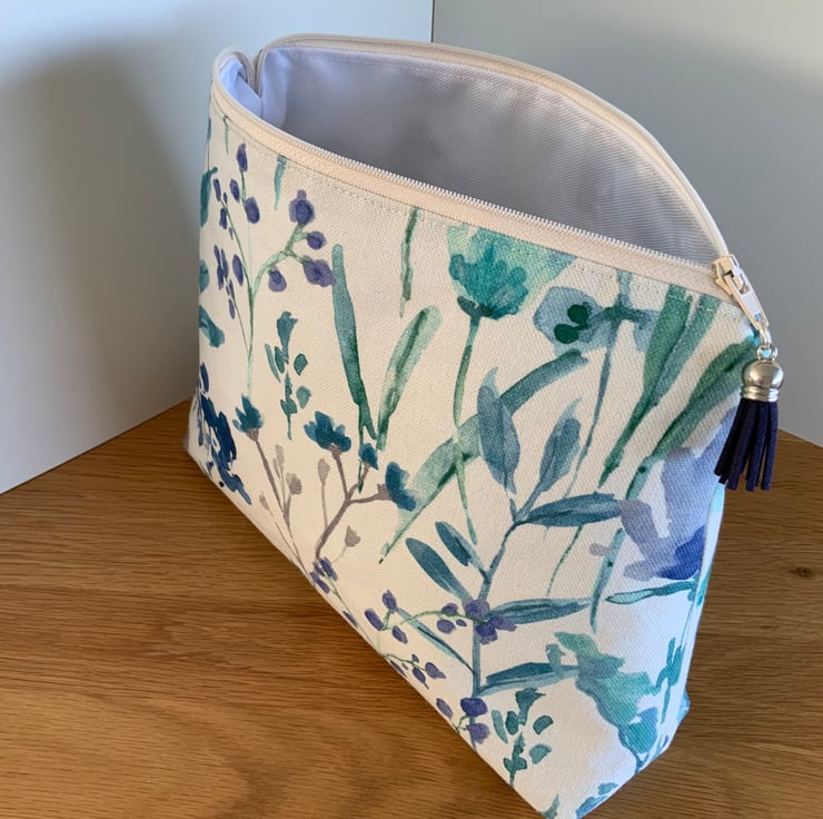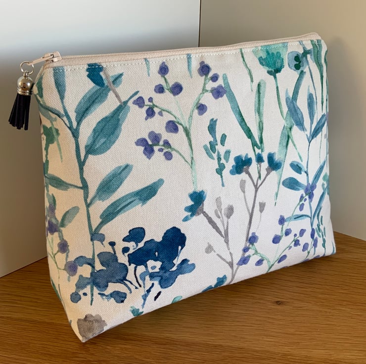 A gorgeous wash bag, perfect for storing your toiletries or cosmetics. It would look stylish on display in a bathroom or on a dressing table but also perfect as a travel accessory to carry your toiletries. This bag is lightly interfaced and is lined with a white waterproof fabric. The zip is finished with a matching tassel.