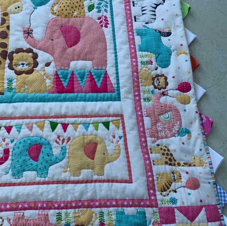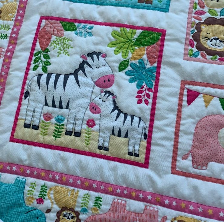 I have hand quilted ths jungle animal themed baby quilt, it is a printed panel that I have hand quilted all around each animal shape including leaves etc, I then finally added a prairie poiunt edge in different coloures.