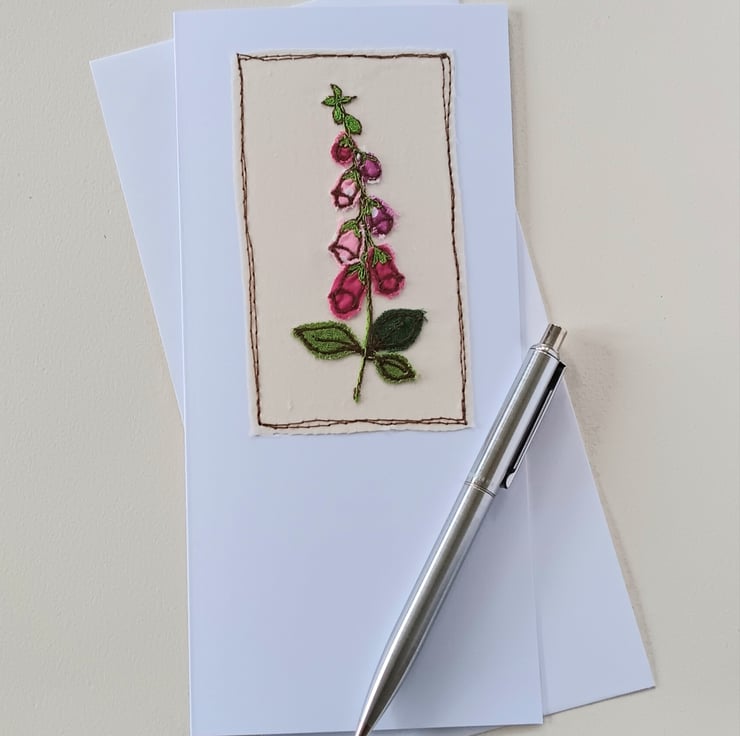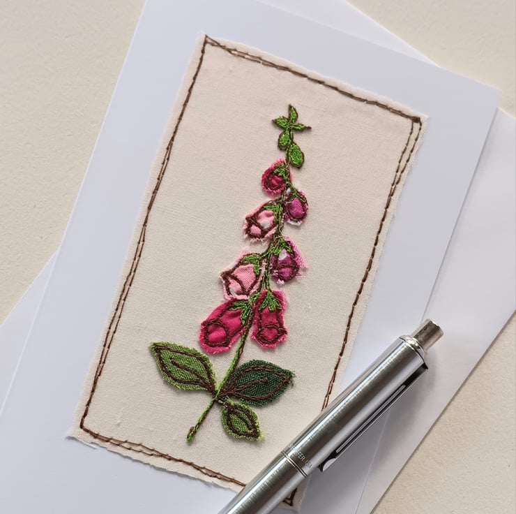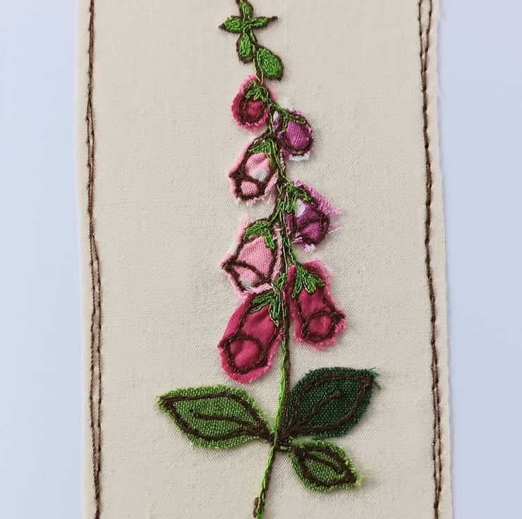 A beautiful textile card depicting a foxglove stem. It is made by individually cutting out little snippets of fabric in greens and pinks and stitching them using free motion embroidery.