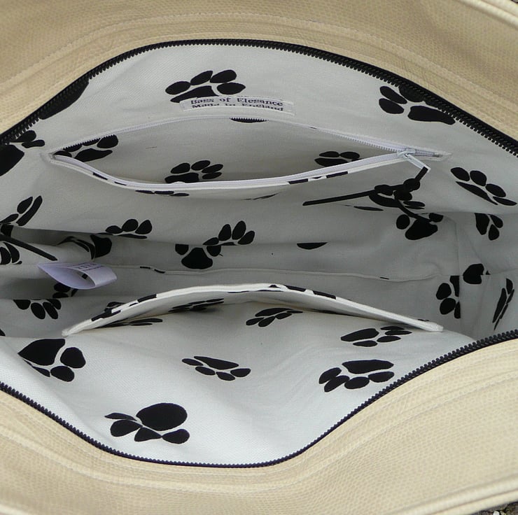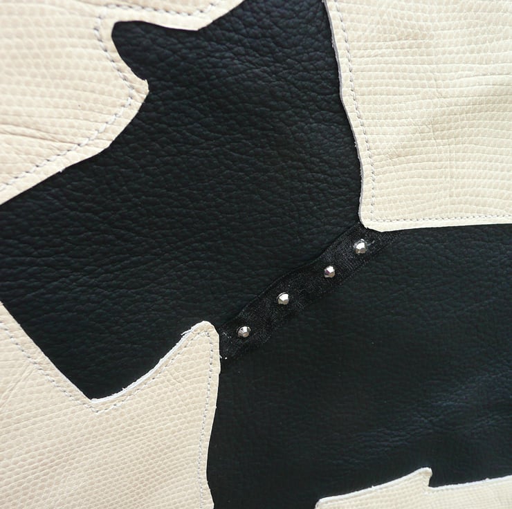 Reverse applique leather Scottie dog tote bag in cream leather, this is a one of a kind cream leather shopping bag with a reverse applique black Scottie dog on the front, ( reverse applique is done with the shape being cut from the bag and a piece of leather placed under the cut out and stiched into place ) This large cream leather tote bag is fully lined in black and white paw print cotton and has a slip pocket and a zip pocket.