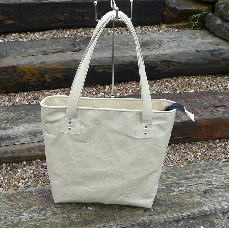 This shopping bag has a black zip recessed top closure, the carry / shoulder straps are made from the same leather and are stitched and riveted into place.