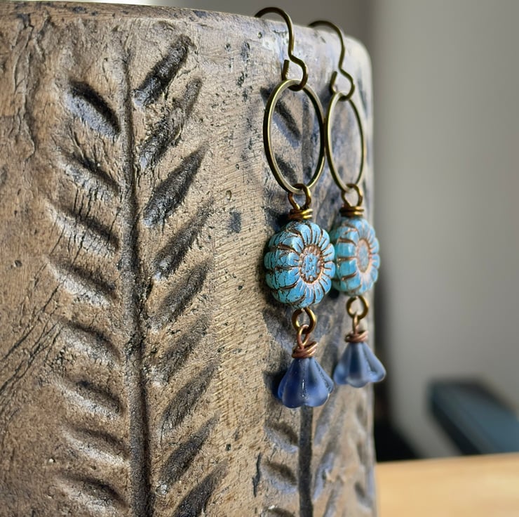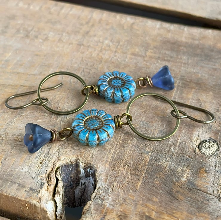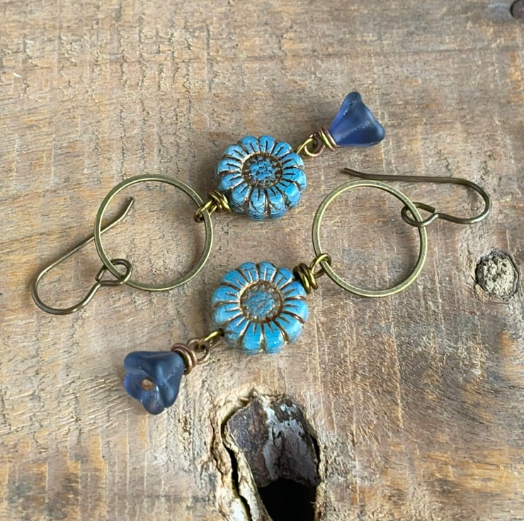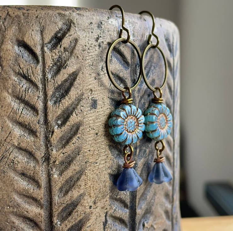 They feature Czech glass sunflower beads in a pretty shade of cornflower blue with a rustic copper wash highlighting their petals and carved centres.