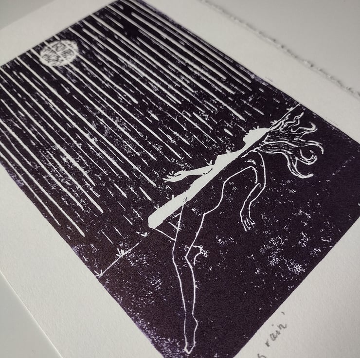 'Feeling rain' is the first in a series of sea inspired linocut art prints. We have hand-carved a beautiful scene featuring a woman in a moment of serenity, floating in the sea on her back. Experiencing the rain as it falls on her face and skin. What are you washing away today? Let the rain wash over you, pour your heart into the sea and feel your senses come alive as each raindrop delicately awakens you - a gentle reminder to stay in the present moment.