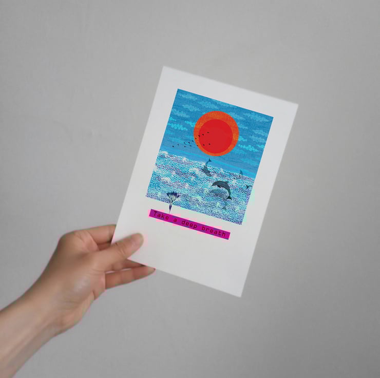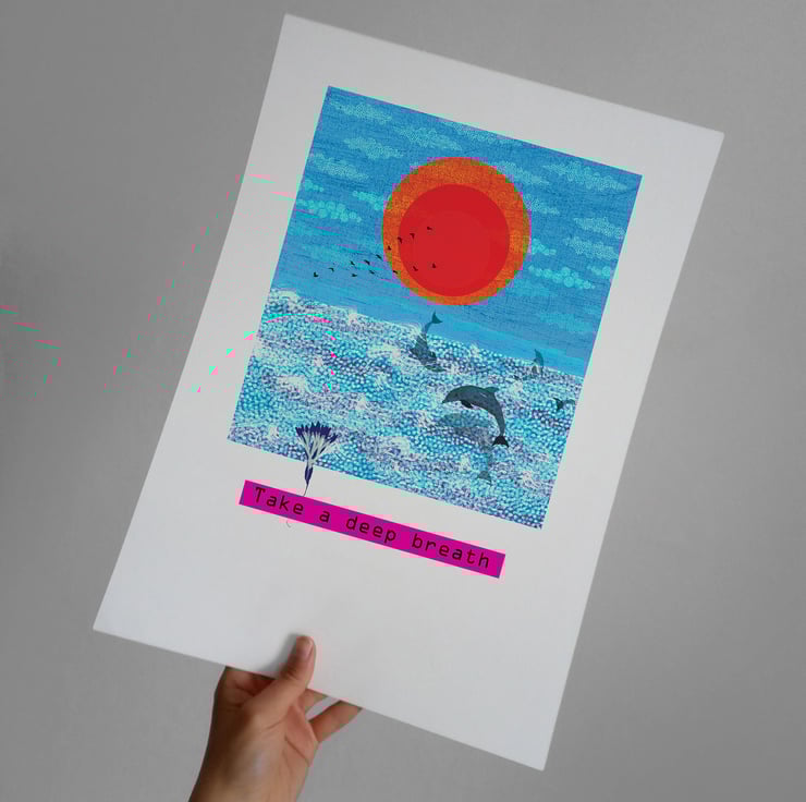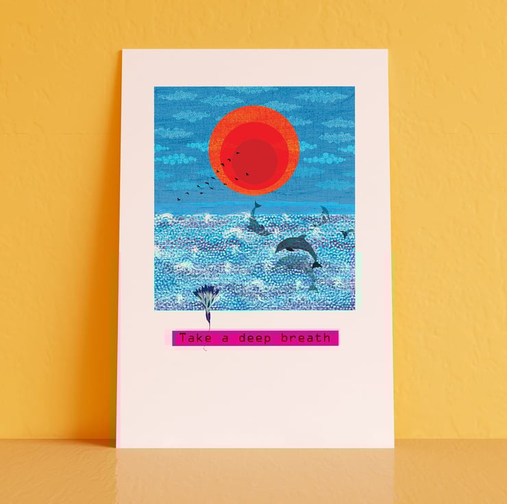 An original digital illustration of a beautiful sunset across the ocean with dolphins in their element, doing what they do best. Reminding us to take a deep breath before carrying on. A simple yet effective reminder for everyone at those times of need. An inspiring print to have around the home, wall art for both children and adults. High quality inks on sustainably sourced and recycled paper.