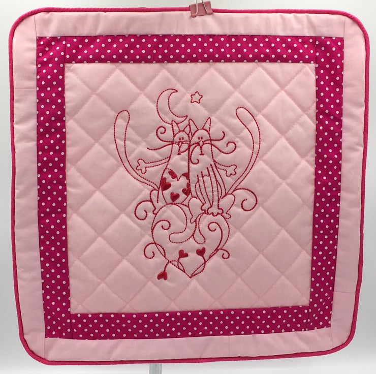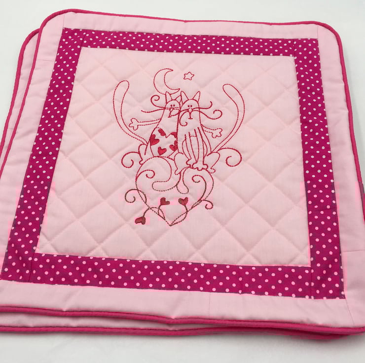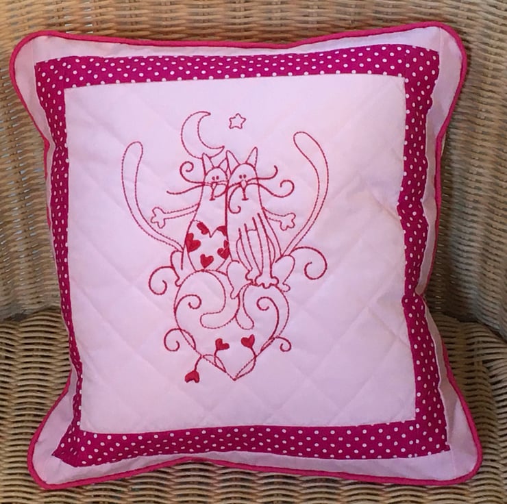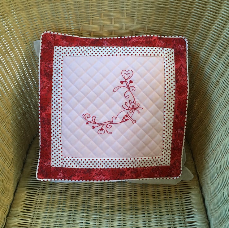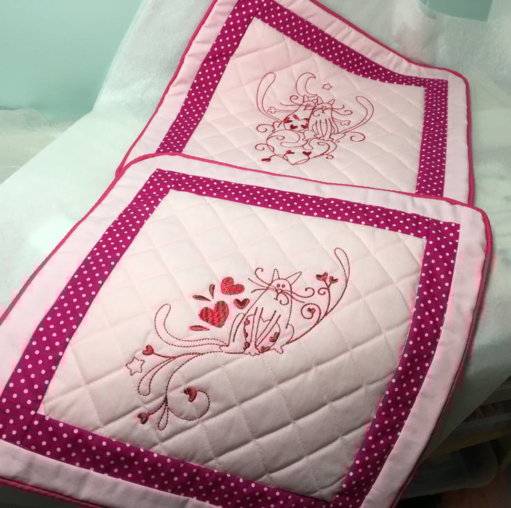 I quilted the fabric, machine embroidered the designs, piped the edges and they have an envelope back.