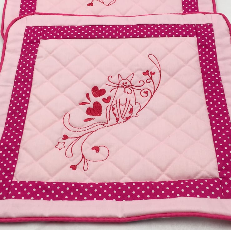 Each pair has two designs with cats entwined with romantic hearts and swirls.