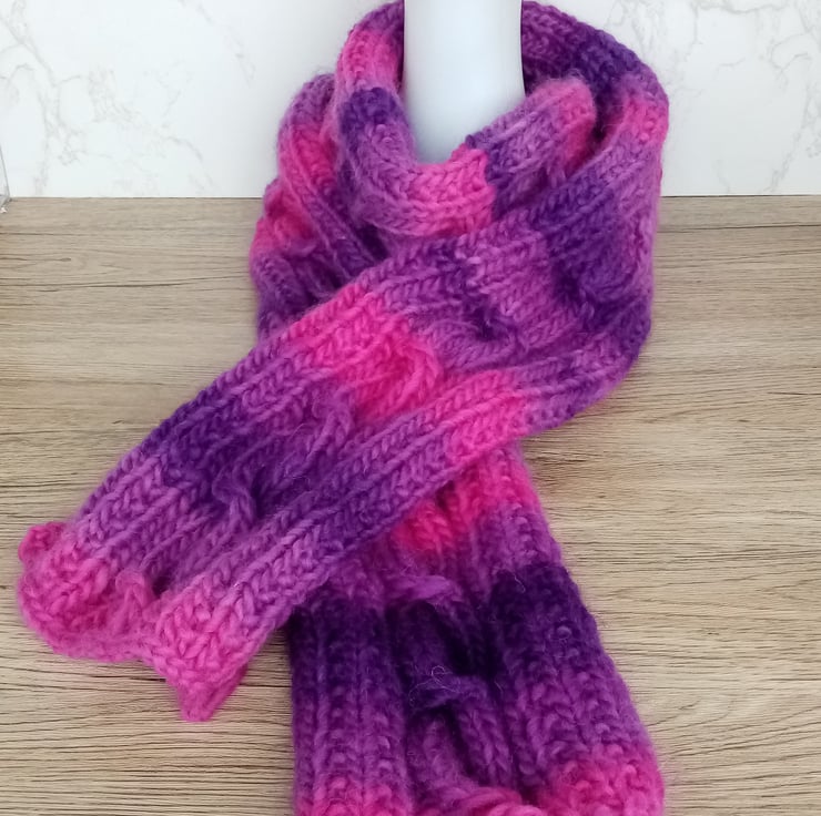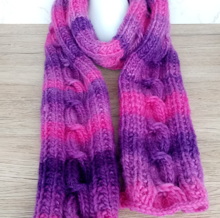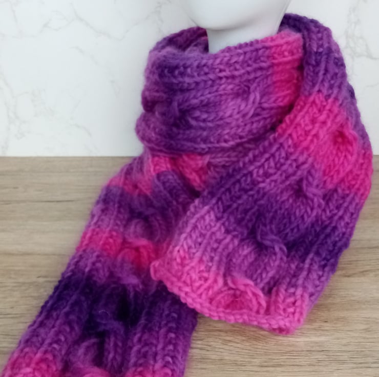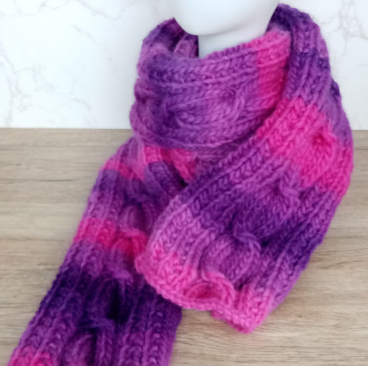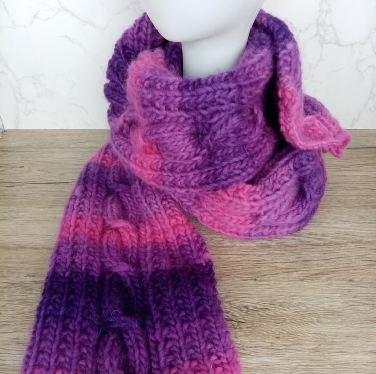 This vibrant cable knit wrap-around scarf in cerise and deep purple stripe is made from pure Norwegian Viking wool and is the perfect Winter Warmer gift for birthdays or special occasions - or just because it's cold outside.