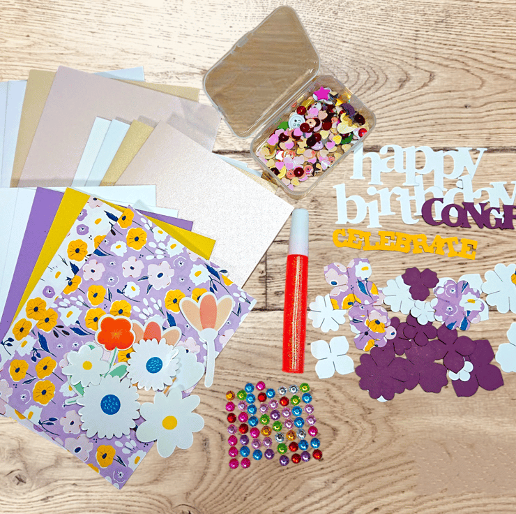This kit contains everything you need to create your own special cards for the ones you love. Each kit contains 4 blank cards and envelopes, 6 blanks, sentiments, rhinestones, embellishments, stickers and a glitter glue stick.