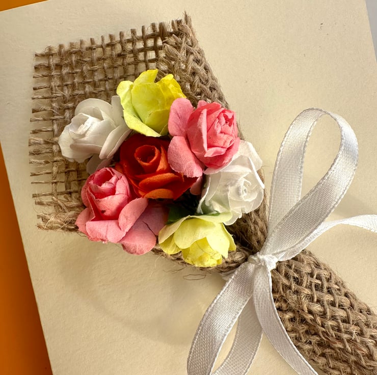 Colourful yellow, pink and white paper roses wrapped in hessian fabric and decorated with white satin ribbon.