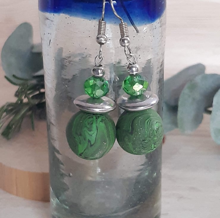 Polymer clay dangly earrings in a green, black and silver unique swirl design.