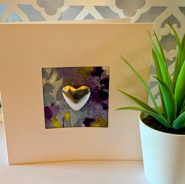 A beautiful silver heart embellishment is the focal point on a watercolour flower background of vibrant lavender yellows and purple hues.