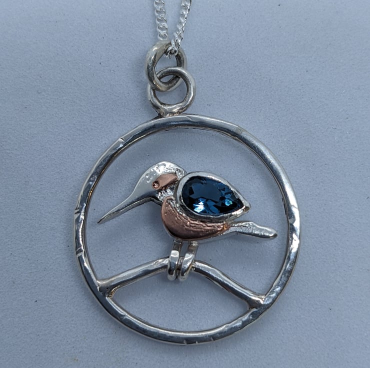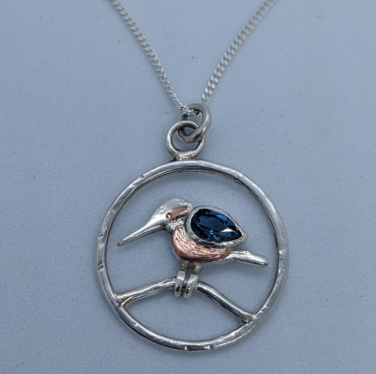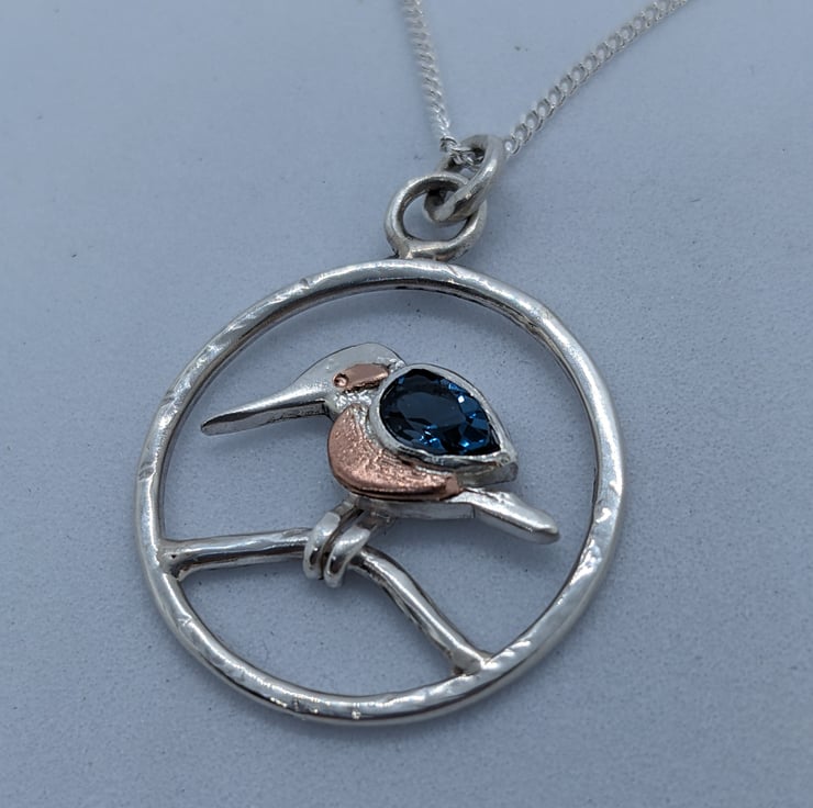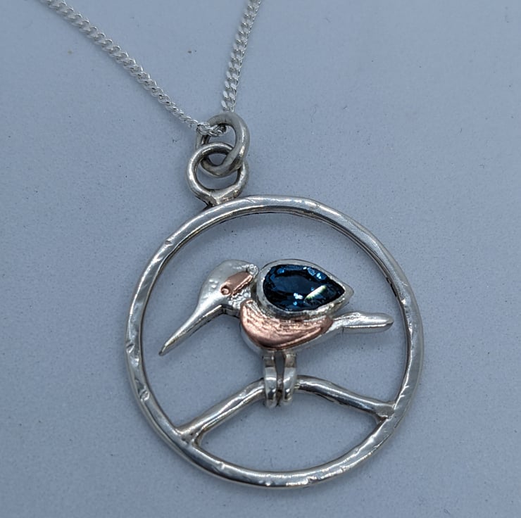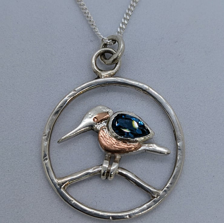 This delicate sterling silver pendant has been completely handcrafted. The kingfisher is hand drawn and saw pierced. A bezel set, pear shaped, faceted topaz gemstone forms its tint wing. I have used copper highlights for his orange breast and for the flash across his eye. The kingfisher sits on a textured sterling silver branch within a hammered ring. It would make a unique birthday gift for a bird lover or Christmas gift for a nature enthusiast. This pendant is hallmarked.
