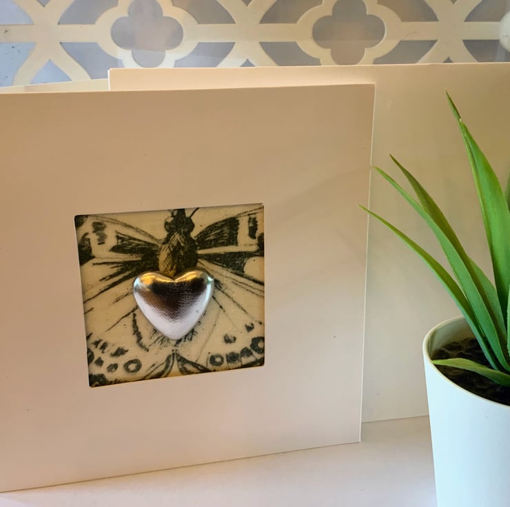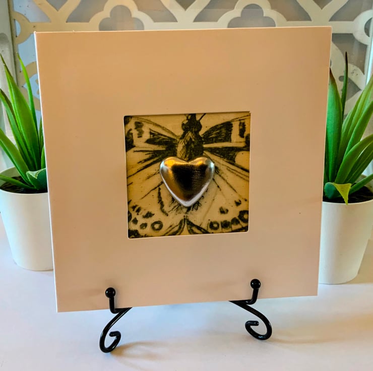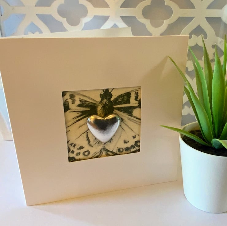A beautiful silver heart embellishment is the focal point on a black and white butterfly background which has been decoupaged using fine rice paper with a suttle hint of sparkle.