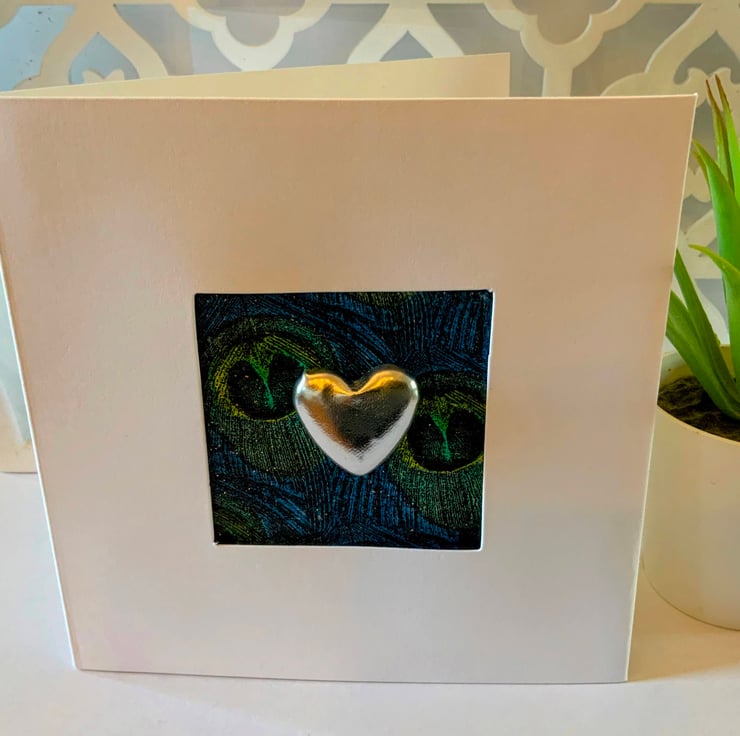 A beautiful silver heart embellishment is the focal point on a dark peacock background which has been decoupaged using fine rice paper with a suttle hint of sparkle.