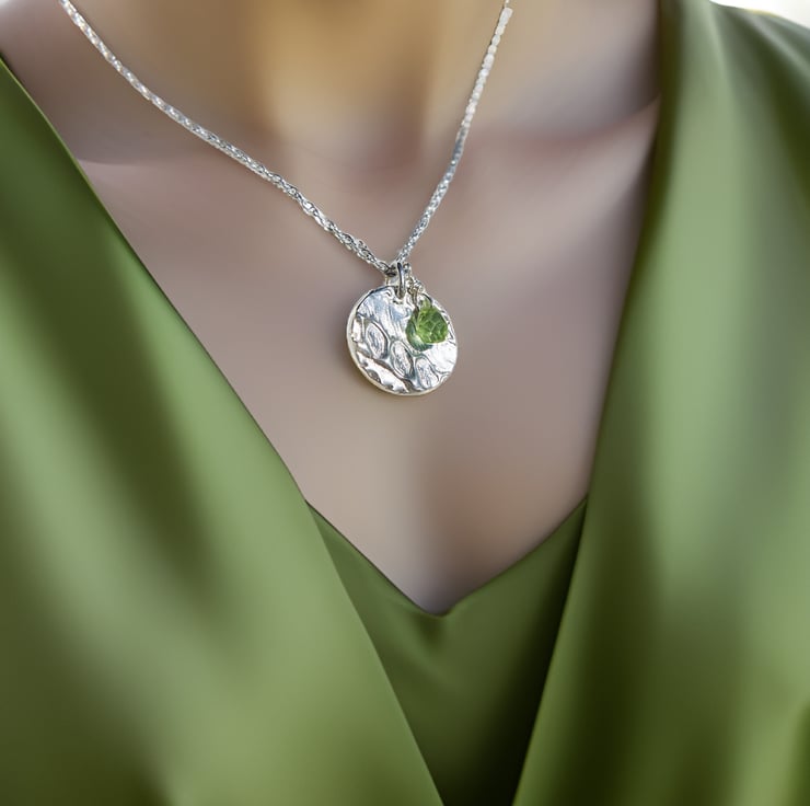 Capture the beauty of your birthstone with these handmade unique pieces of artisanal jewellery. Crafted with eco-friendlyrecycled fine silvered decorated with an organic patterned finish.Fine silver is made with 99.9% silver. Each pendant features your birthstone or desired gemstone. The pendant is 15mm in size. Comes with a sterling silver 45cm chain.