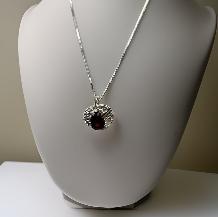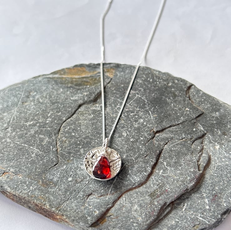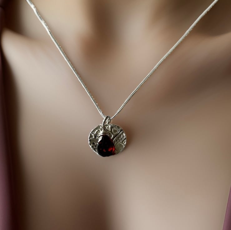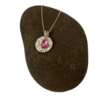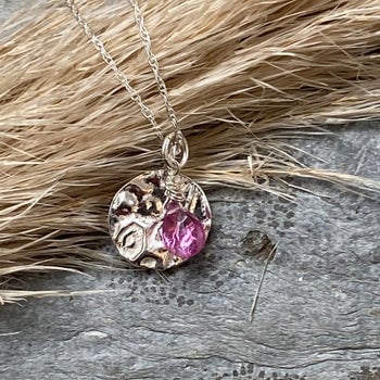 Capture the beauty of your birthstone with these handmade unique pieces of artisanal jewellery. Crafted with eco-friendlyrecycled fine silvered decorated with an organic patterned finish.Fine silver is made with 99.9% silver. Each pendant features your birthstone or desired gemstone. The pendant is 15mm in size. Comes with a sterling silver 45cm chain.