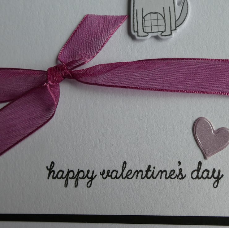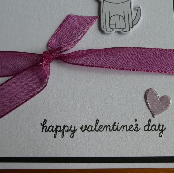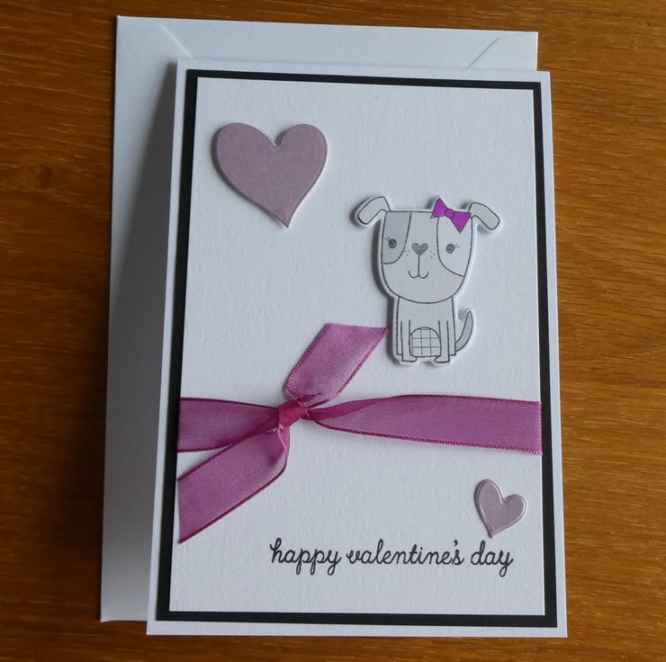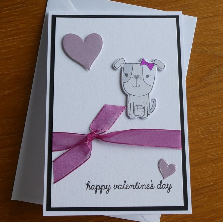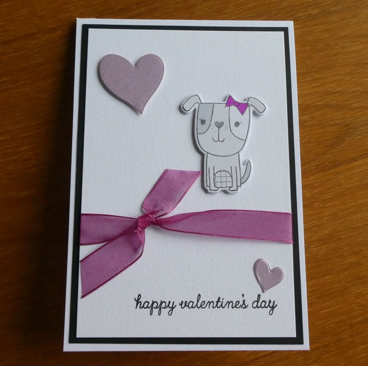 The dog has been hand stamped and inked in shades of plum and grey and then die cut and fixed with foam pads to raise it slightly from the background. Two hearts, die cut from pearlescent lilac card have been added and the greeting 'happy valentine's day' has been stamped in black archival ink.