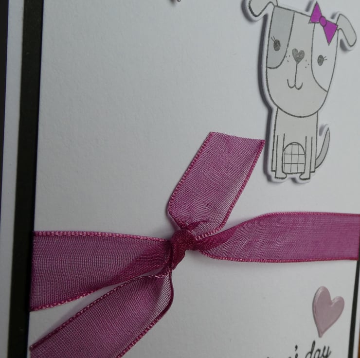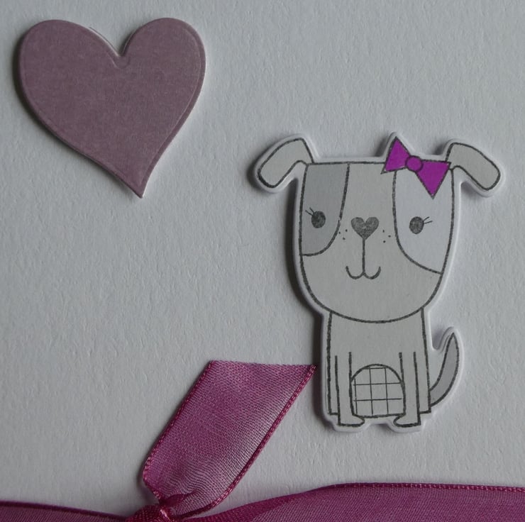 With an image of a dog with a plum hair bow and two pearlescent lilac hearts this cute valentine's card is ideal to send to someone special.