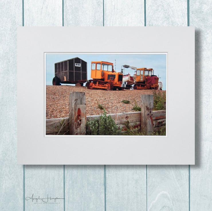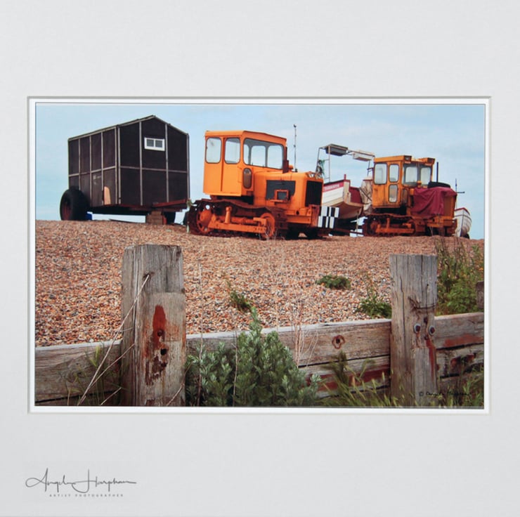 Colour photograph of tractors boats and a hut on a shingle beach in Norfolk near Blakeney with white mount and backing board.