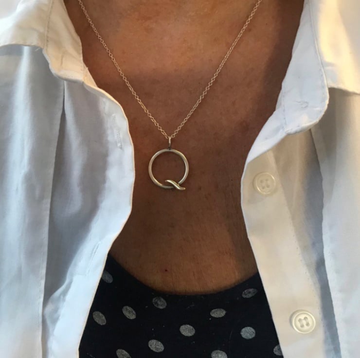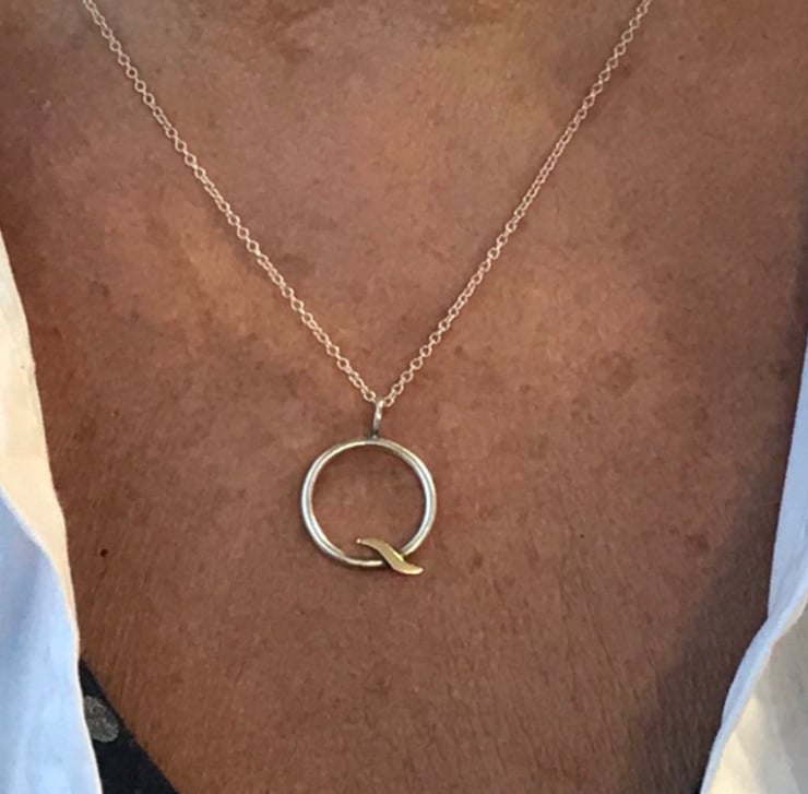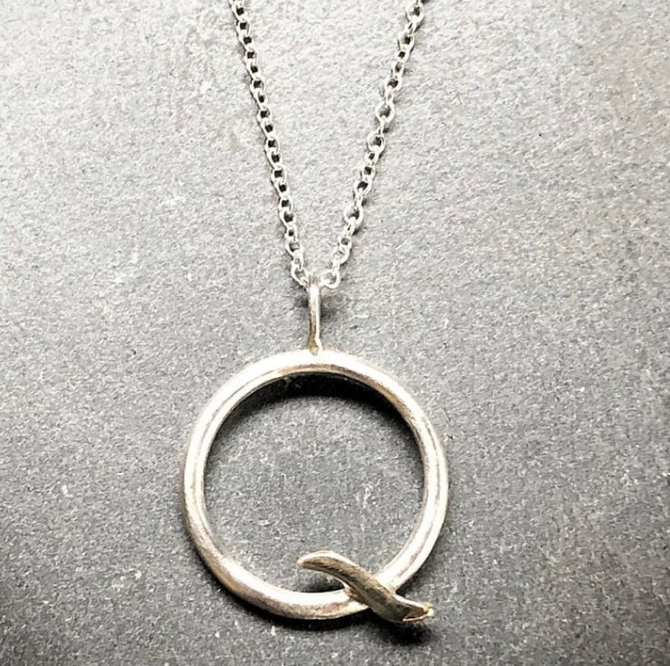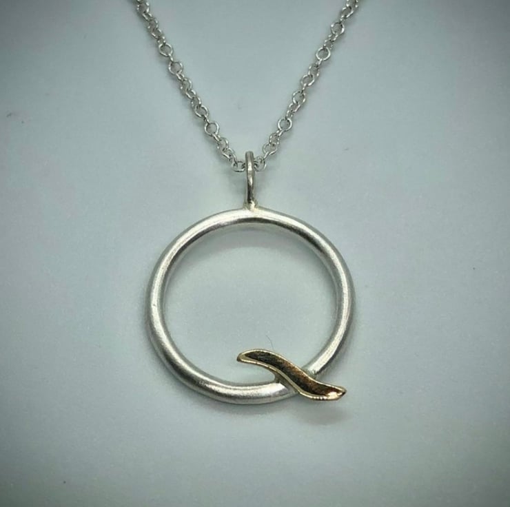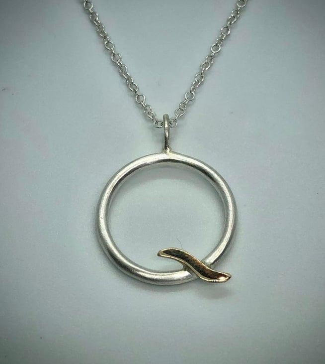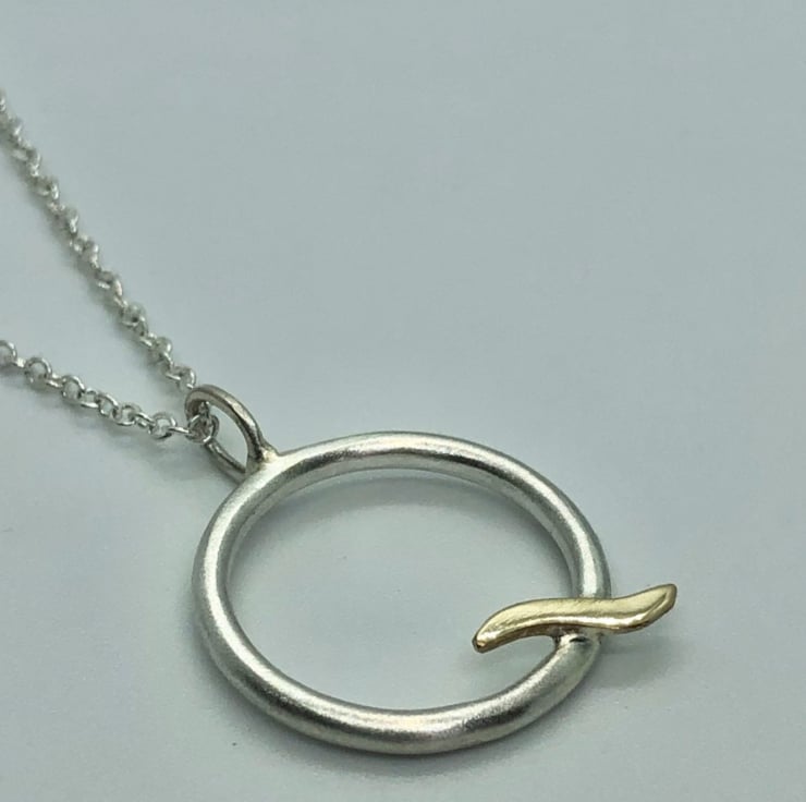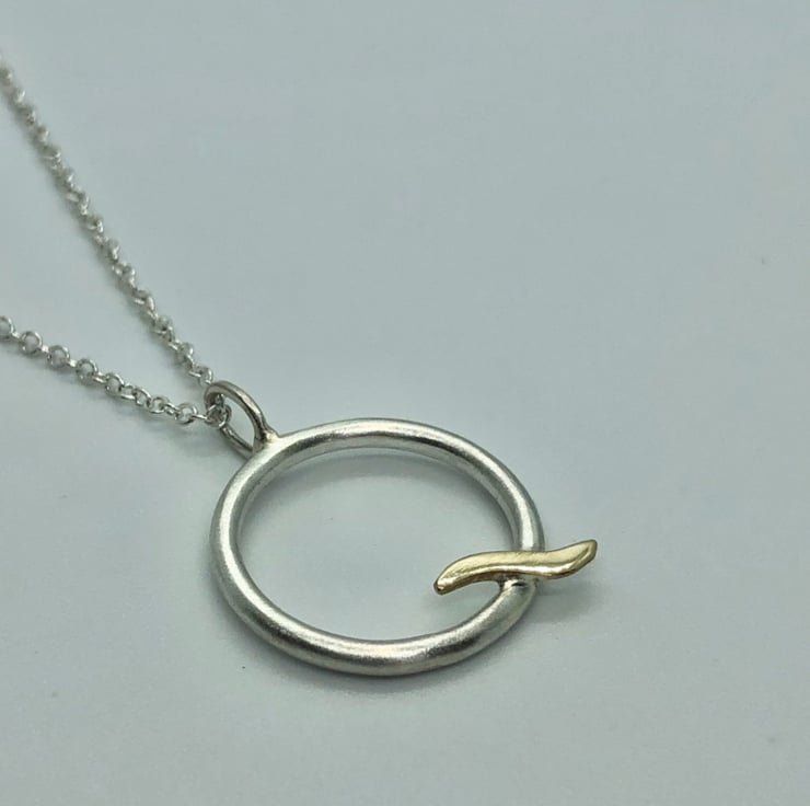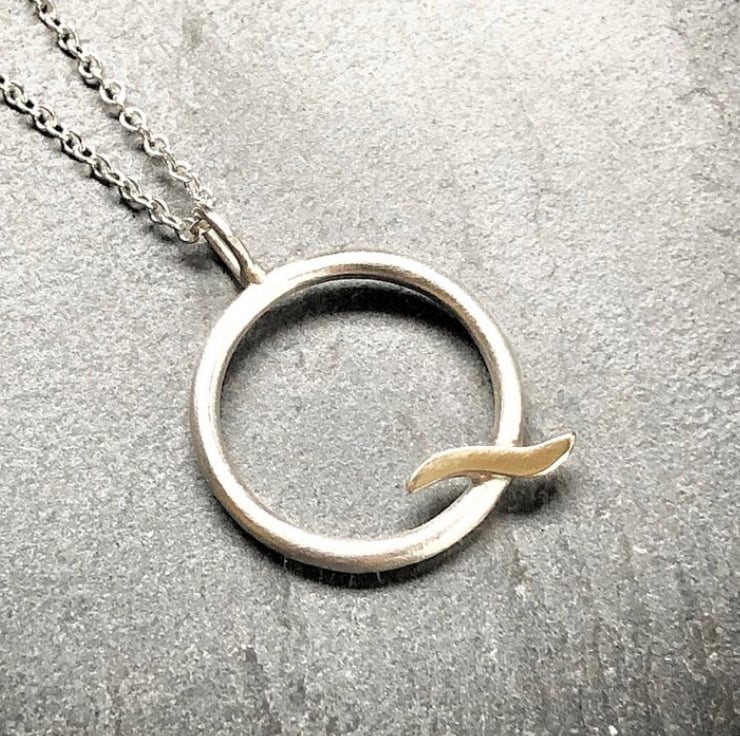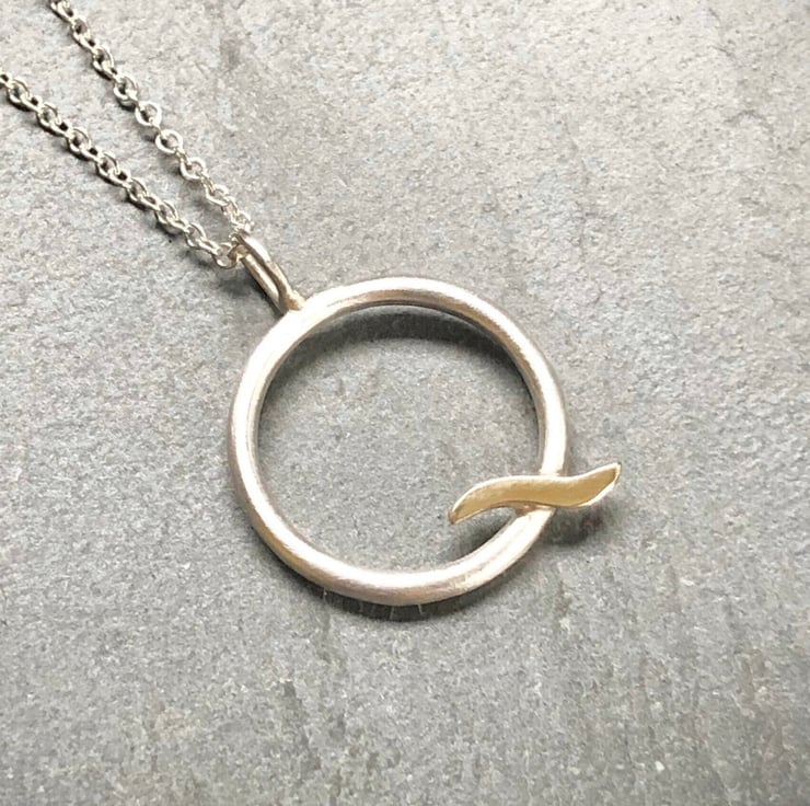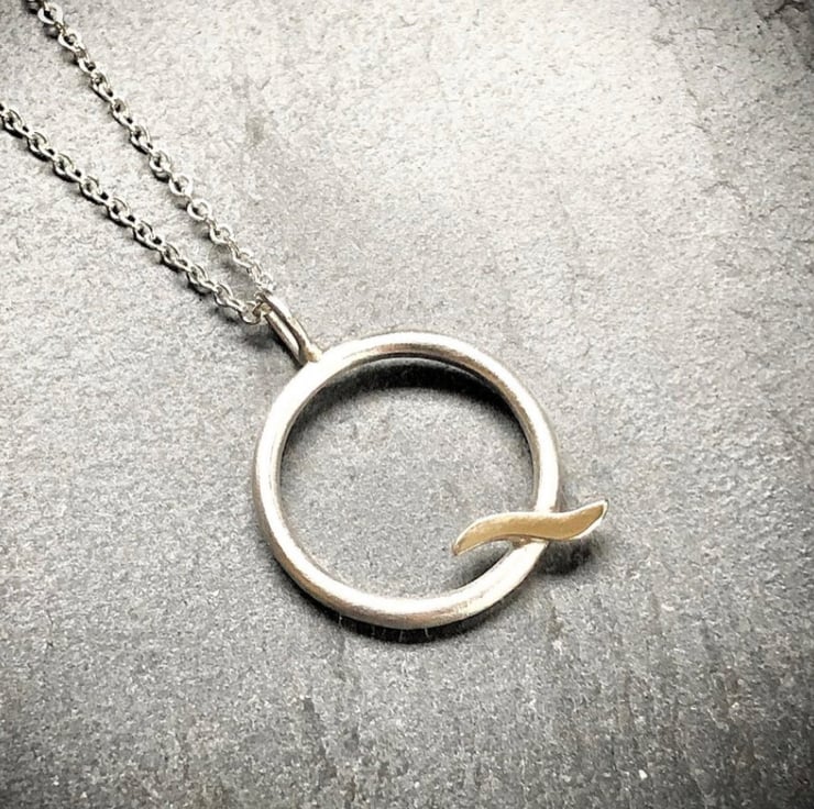This Gold Wave Pendant is made from satin finished Sterling Silver and shiny real 9ct yello w gold. The circle is made from approximately 3mm round wire and hangs on an 18” Sterling Silver chain.