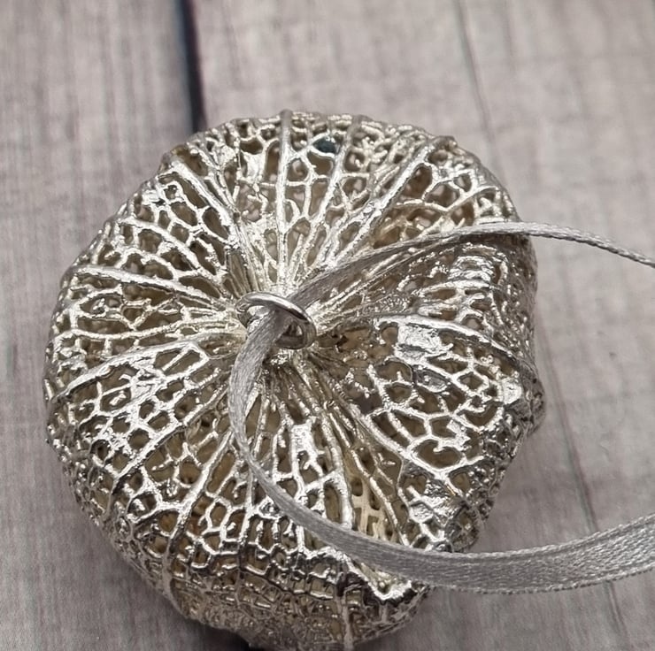 This skeletal Physalis husk was a bit squished when I found it but I thought it was still very beautiful so I covered it in silver anyway! It measures approximately 2cm high by 4cm across. It would be a beautiful decoration in any room, the perfect gift for the person who has everything!