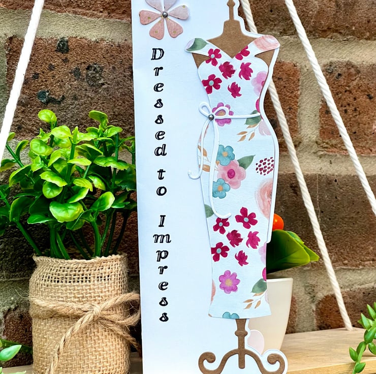There is a ‘Dressed to Impress’ stamped message also on the front of this card. The card measures approximately 20.5cm x 7.5cm and includes a white DL envelope approximately 22cm x 11cm. The inside of the card has been left blank for your message.