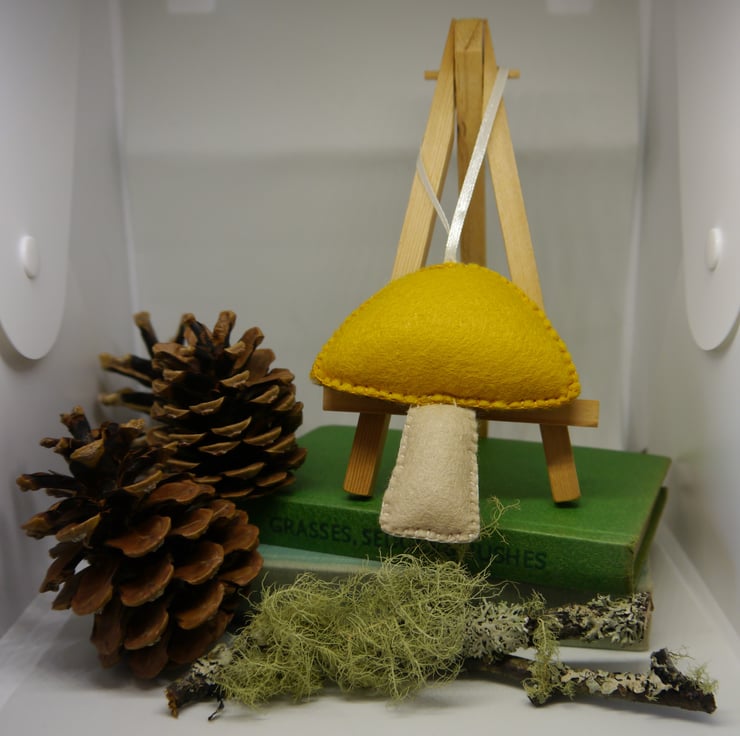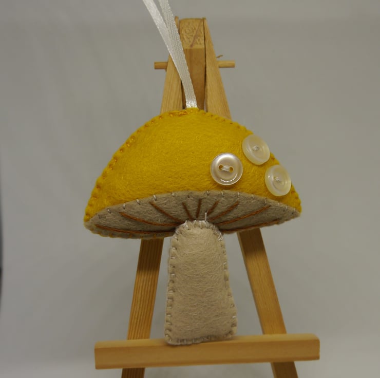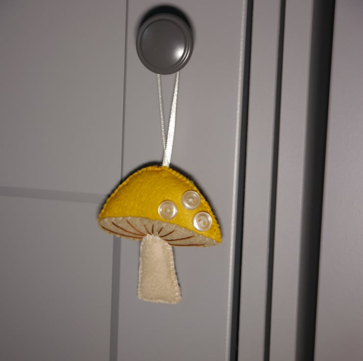 This handstitched hanging felt toadstool decoration stems from my love of all things autumn although it would also be perfect for Christmas or any time, adorning a handle of hook to give that trendy cottagecore feel. Made from my own design this toadstool in an on trend Mustard yellow and warm cream felt is completely hand sewn and stuffed with 100% polyester hollow fibre filling finished with vintage pearl white buttons and thin satin hanging loop. Approximate measurements are three and a quarter inches (8cm) at widest point by three and a half inches (9cm) excluding hanging loop. Created in a pet and smoke free home. This item is designed as a decoration not a toy.