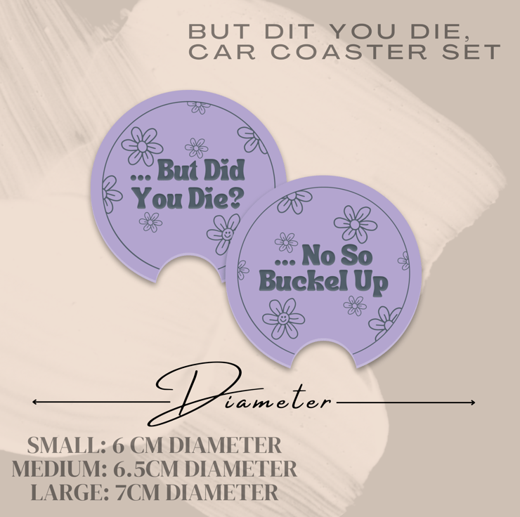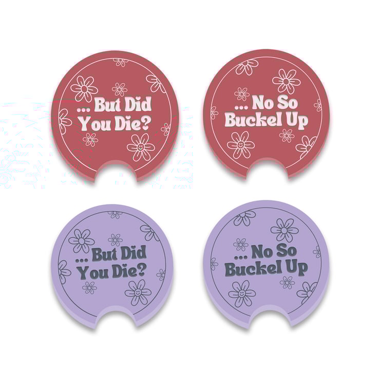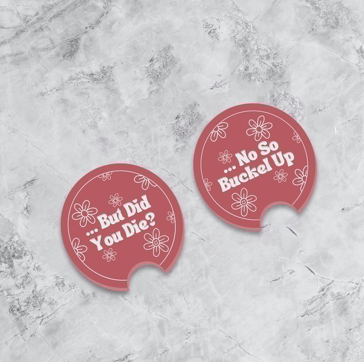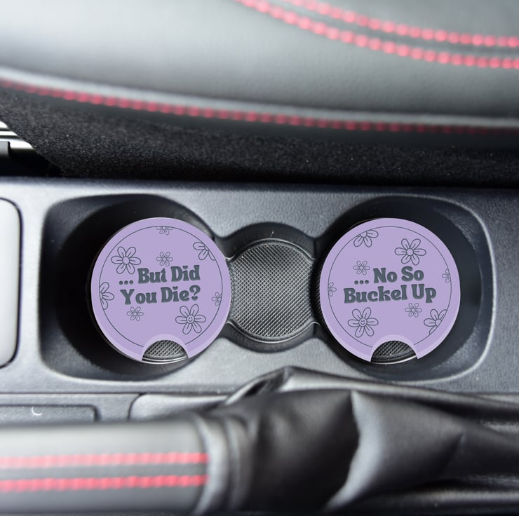 A set of two car coasters that effortlessly blend practicality with humour. Crafted with durability in mind, these coasters are designed to protect your car's cup holders from spills and stains, ensuring your vehicle stays as clean and stylish as ever. Upgrade your car's interior with a touch of personality and a dash of humour.