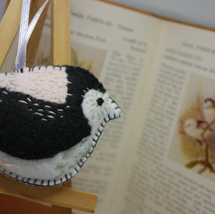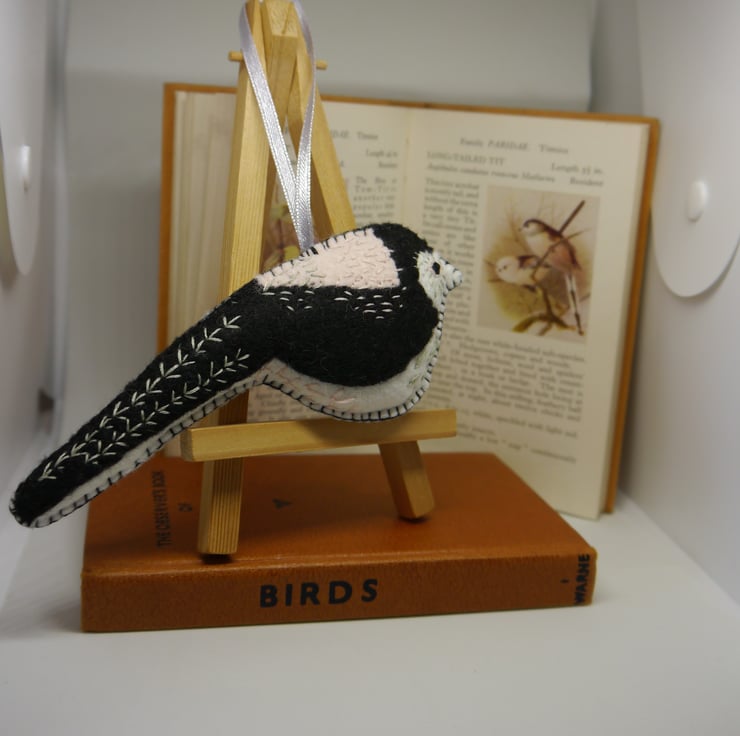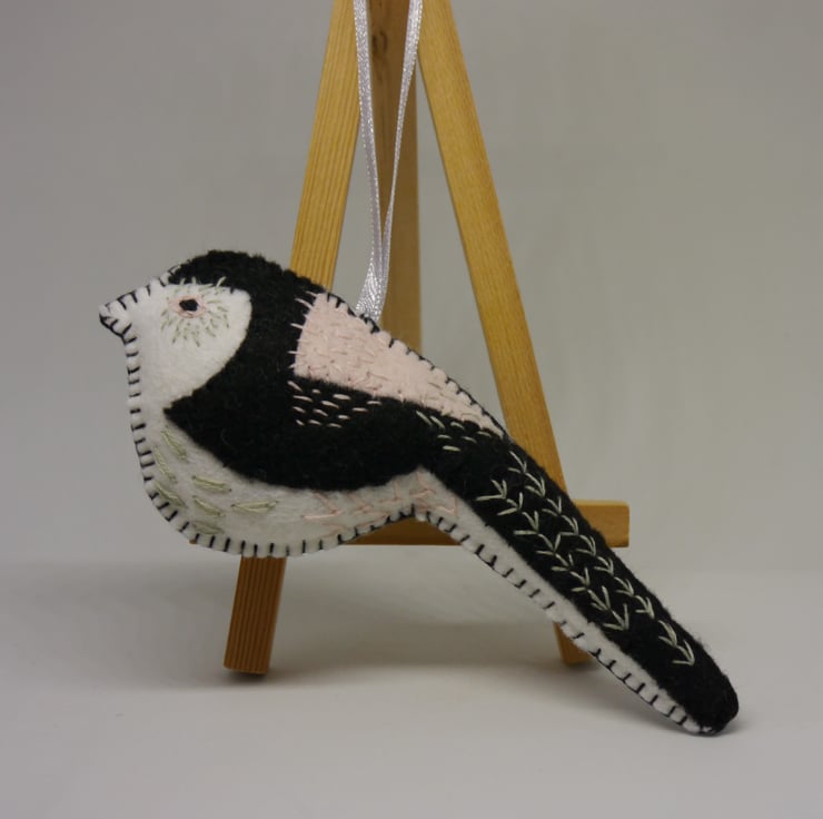 This adorable long-tailed tit is lovingly made in soft felt and hand embroidered with delicate stitches. Pattern designed by me as an expansion of my felt bird range. Presented in side profile with stitching on both sides it is lightly stuffed to give a pleasing shape and finished off with a thin satin ribbon hanging loop. Measuring approximately five and a half inches (14cm) across by three and a half inches (9cm) excluding hanging loop. This would look great adorning any hook or handle, or even on the Christmas tree, a prefect gift of any bird lover. Created in a smoke and pet free home, designed as a decoration not a toy.