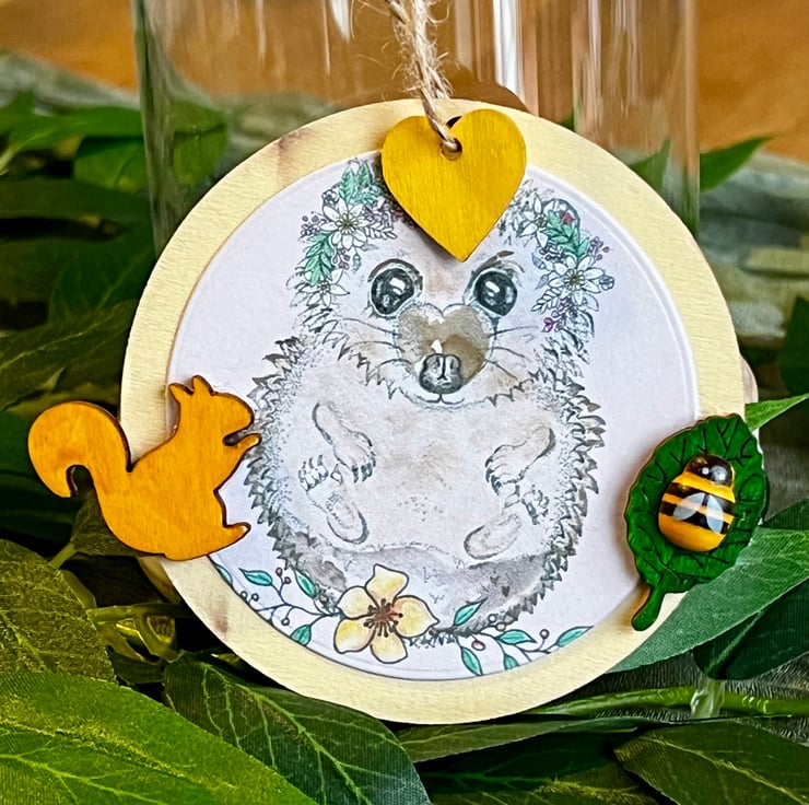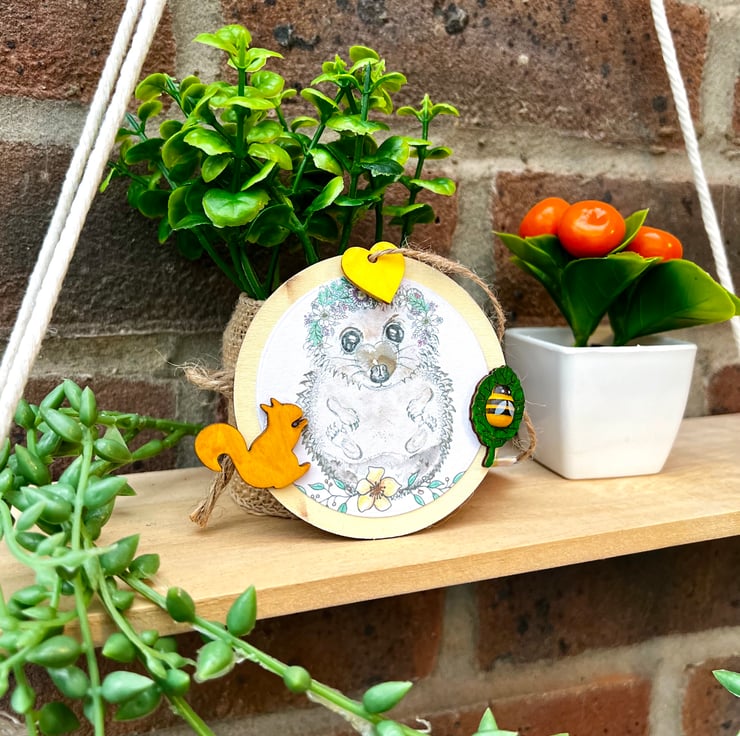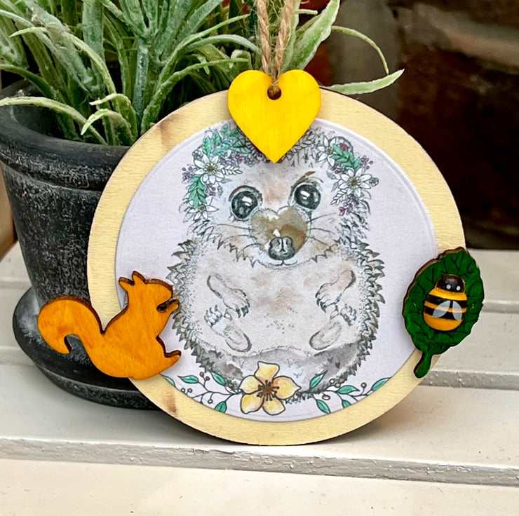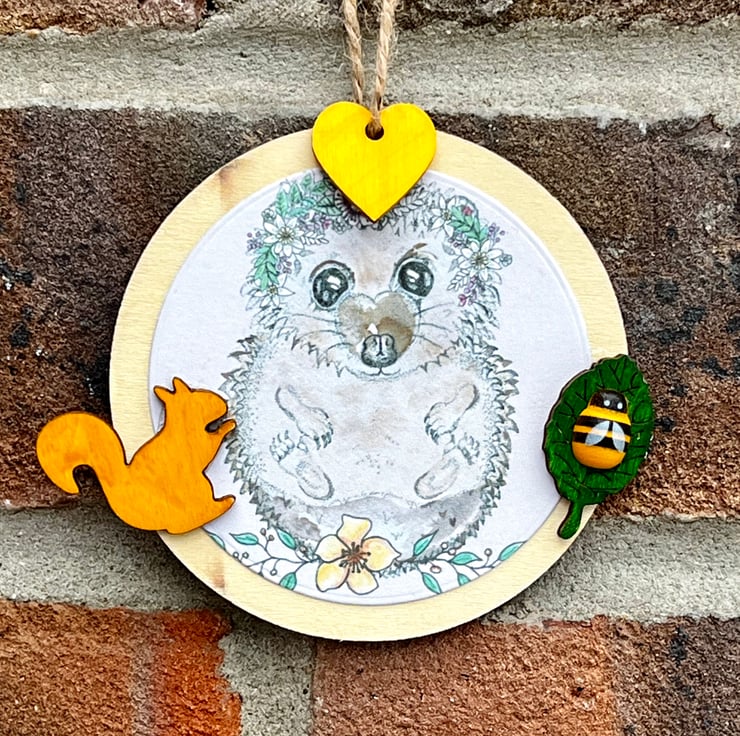 ‘Wooden hanging decoration’ - Artists Illustration of a hedgehog with bee. This image is a colour print of my pen illustration featuring a cute hedgehog. It has been printed on 120gsm ultra-bright silky paper and placed on a 8x8cm approximate wooden circle. It is then finished with small wooden decorative crafts including a squirrel & bee. This item is handmade & hand painted with acrylic paints.