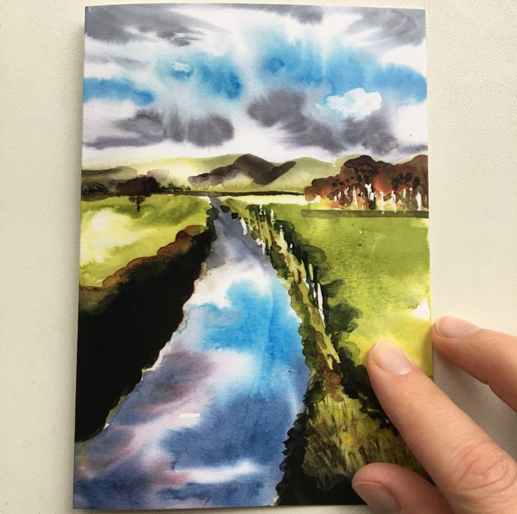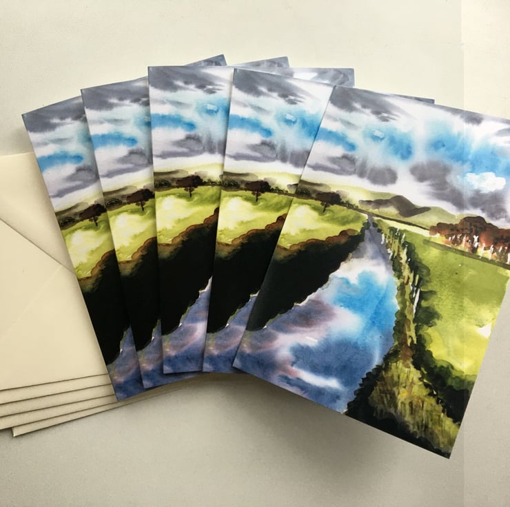 A pack of five identical printed greetings cards, depicting the Afon Fathew river in North Wales, from an original watercolour painting. Blank inside for any occasion. Complete with cream envelopes