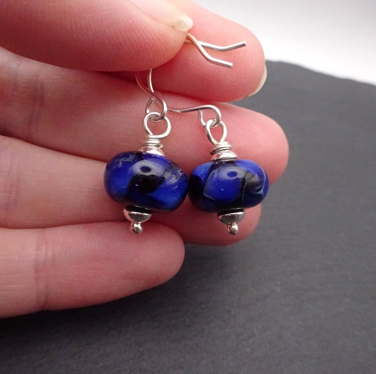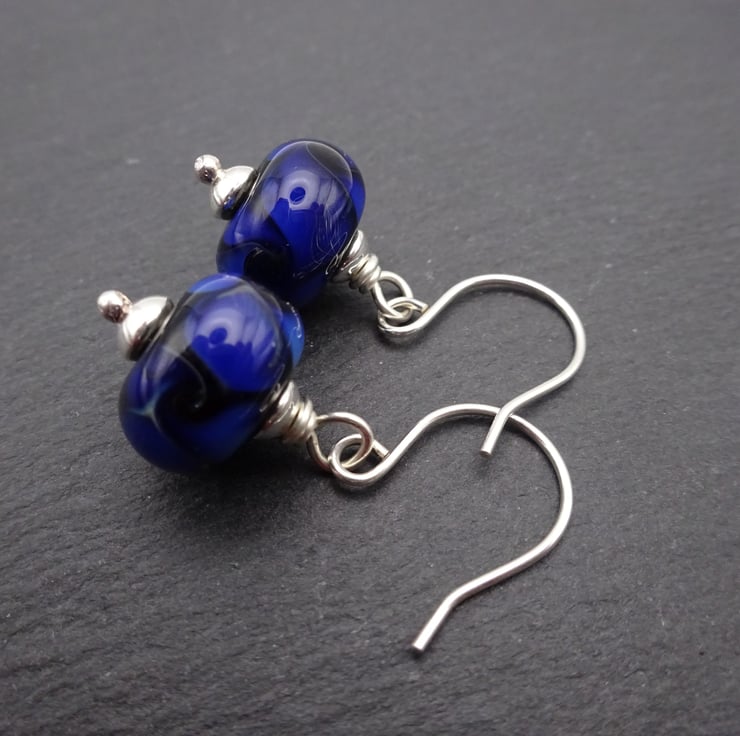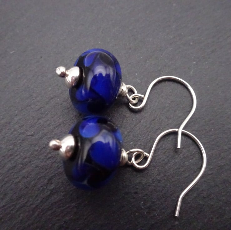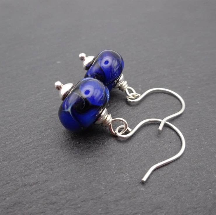 A pair of earrings made with handmade sterling silver ear wires, sterling silver beads and handmade lampwork glass beads.